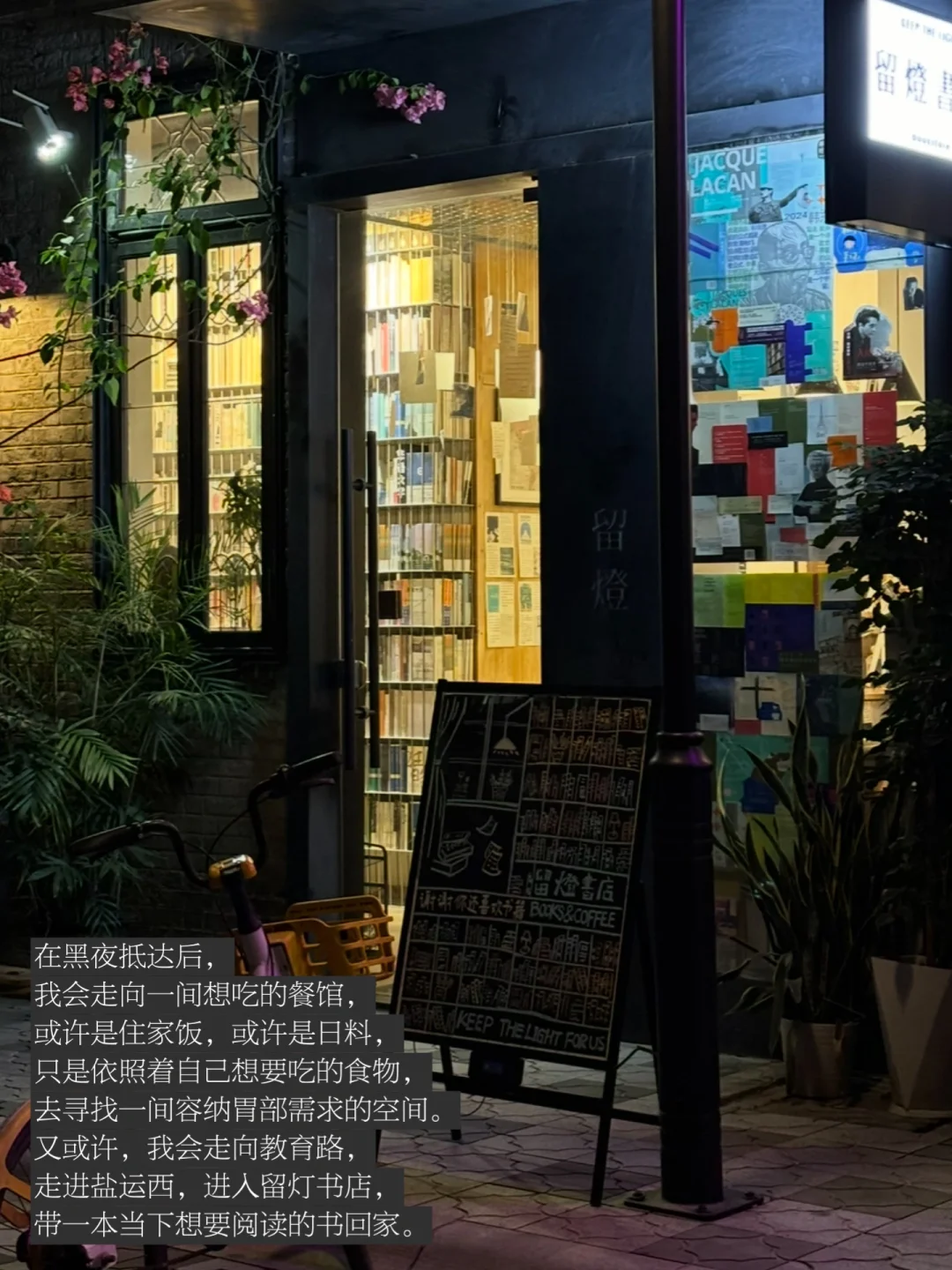在黑夜抵达后,我会走向一间想吃的餐馆,或许是住家饭,或许是日料,只是依照着自己想要吃的食物,去寻找一间容纳胃部需求的空间。又或许,我会走向教育路,走进盐运西,进入留灯书店,带一本当下想要阅读的书回家。