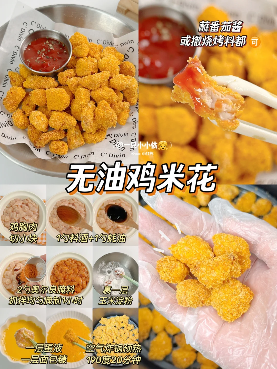 🔹制作:鸡胸肉洗净切小块,1勺料酒+1勺蚝油+2勺奥尔良腌料,抓拌均匀腌制1小时;依次裹一层玉米淀粉、一层蛋液、一层面包糠,空气炸锅预热190度20分钟