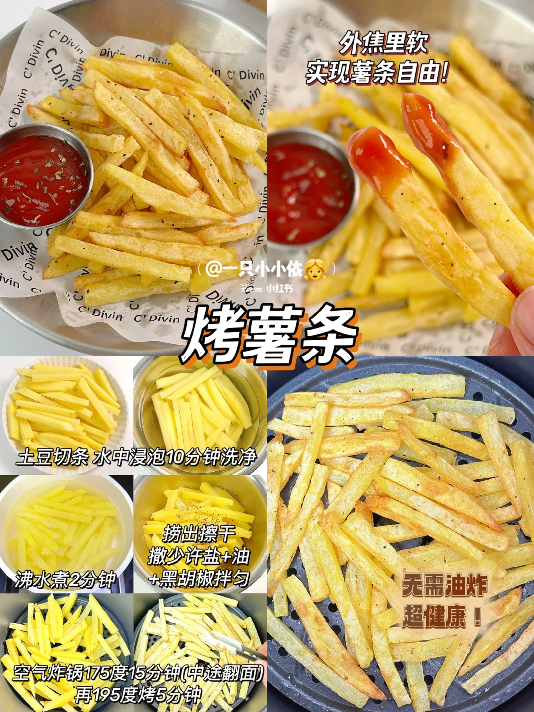 🔹制作:土豆切条,水中浸泡10分钟洗干净;沸水煮2分钟,捞出擦干,撒少许盐、橄榄油、黑胡椒拌匀;空气炸锅175度15分钟(中途翻面),再195度烤5分钟