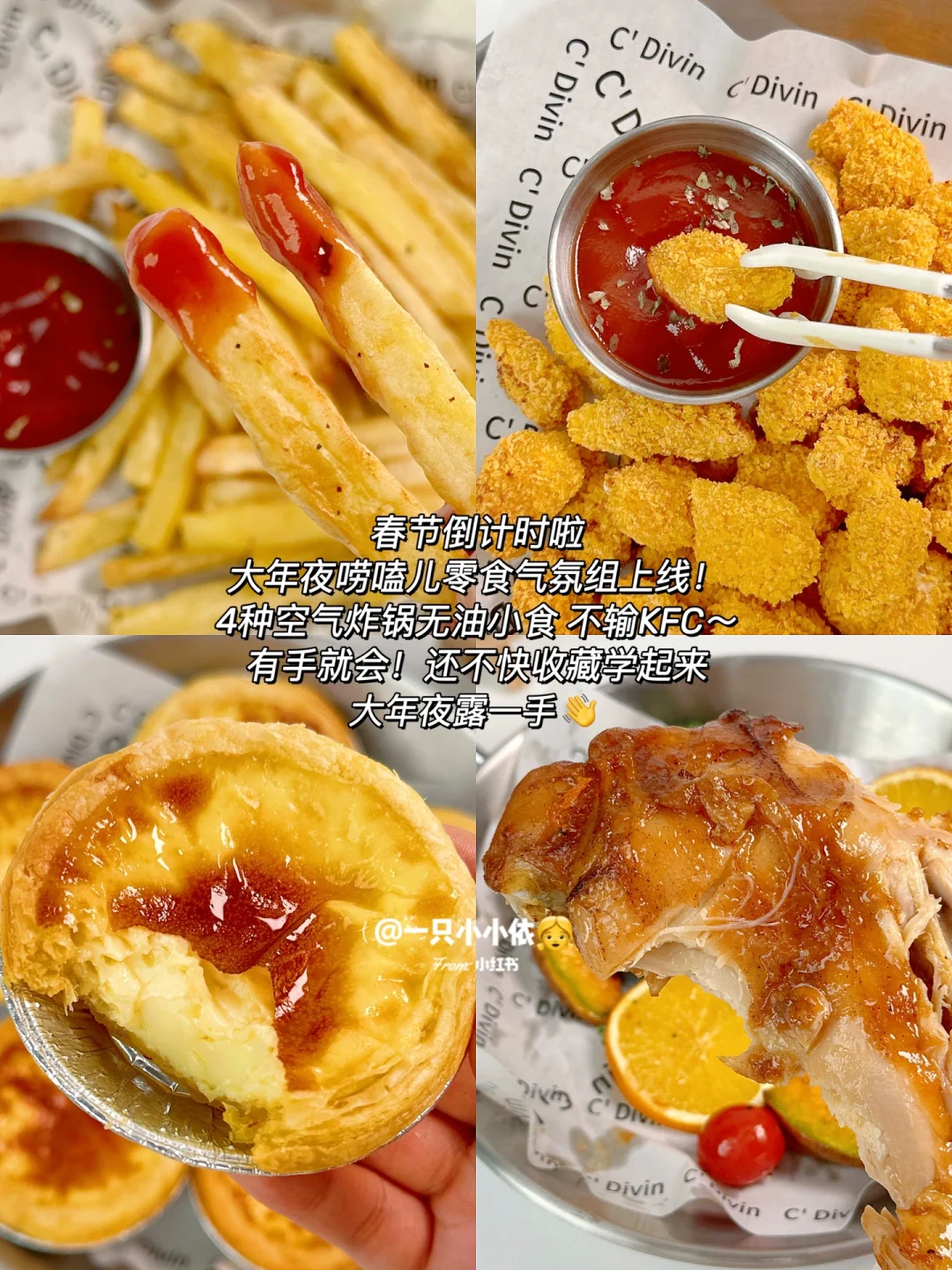 ✨简单好吃的空气炸锅小食拼盘,给各位仙女安排上~自制鸡米花、蛋挞、薯条、蜜汁手枪腿,低卡免油炸,好吃更健康👏🏻悄悄点赞收藏,学会了年夜饭露一手,惊艳everyone!😎