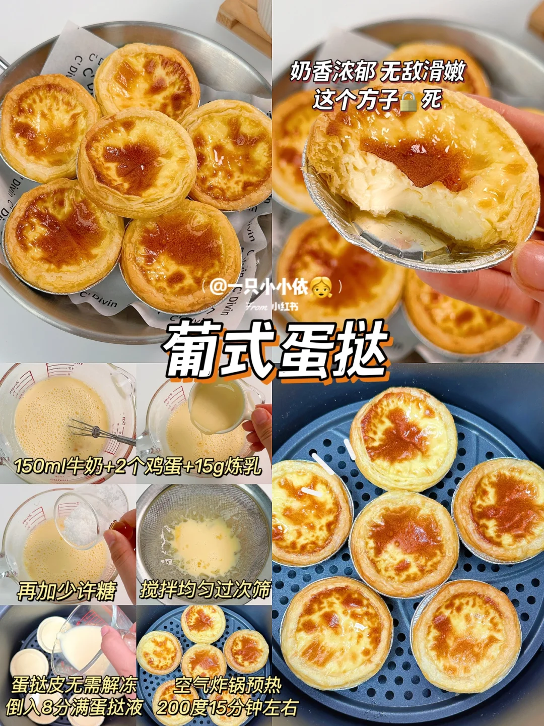 🔹制作:牛奶+鸡蛋+炼乳+少许糖搅拌均匀,过筛一次;蛋挞皮无需解冻,倒入8分满蛋挞液,空气炸锅预热200度15分钟左右