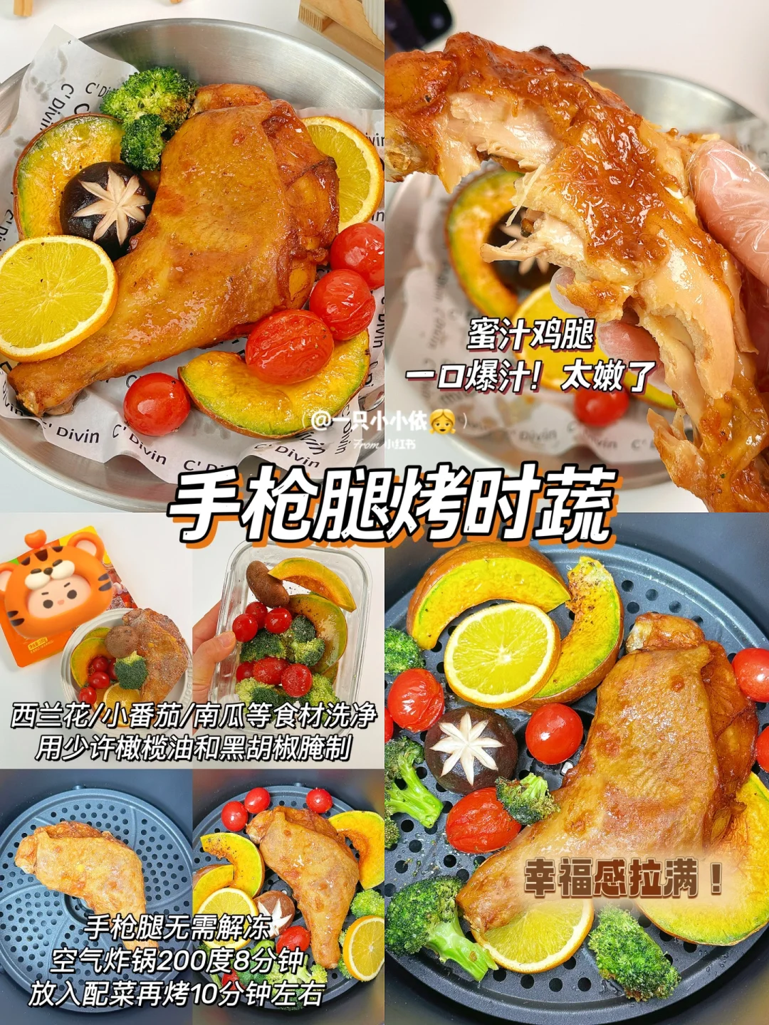 🔹制作:配菜洗净,用少许橄榄油和黑胡椒腌制片刻;手枪腿无需解冻,空气炸锅200度8分钟,放入配菜再烤10分钟左右