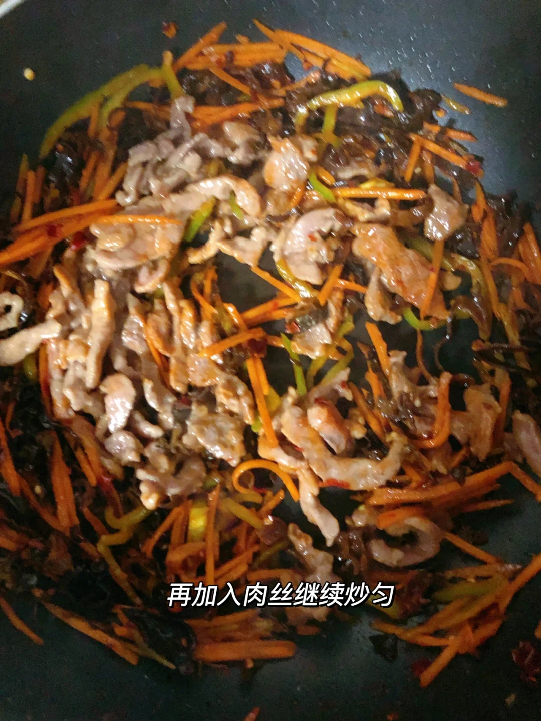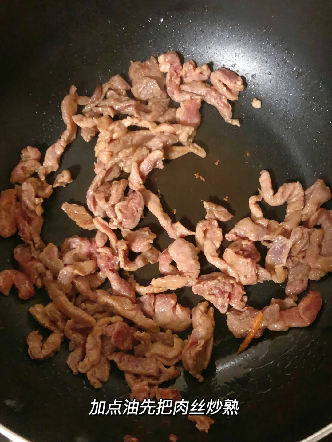 1⃣️肉丝加生抽、料酒、淀粉抓匀腌制十分钟,然后放进锅里炒熟。