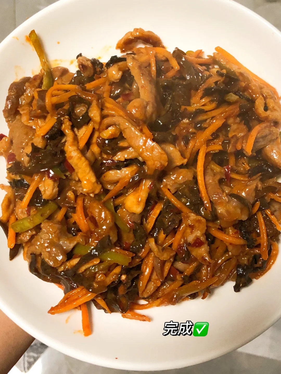 3⃣️油锅加入蒜末爆香,加入豆瓣酱炒出红油之后,加入切好的胡萝卜、辣椒、木耳,然后加入鱼香汁,再加入刚刚的肉丝,炒匀之后出锅。