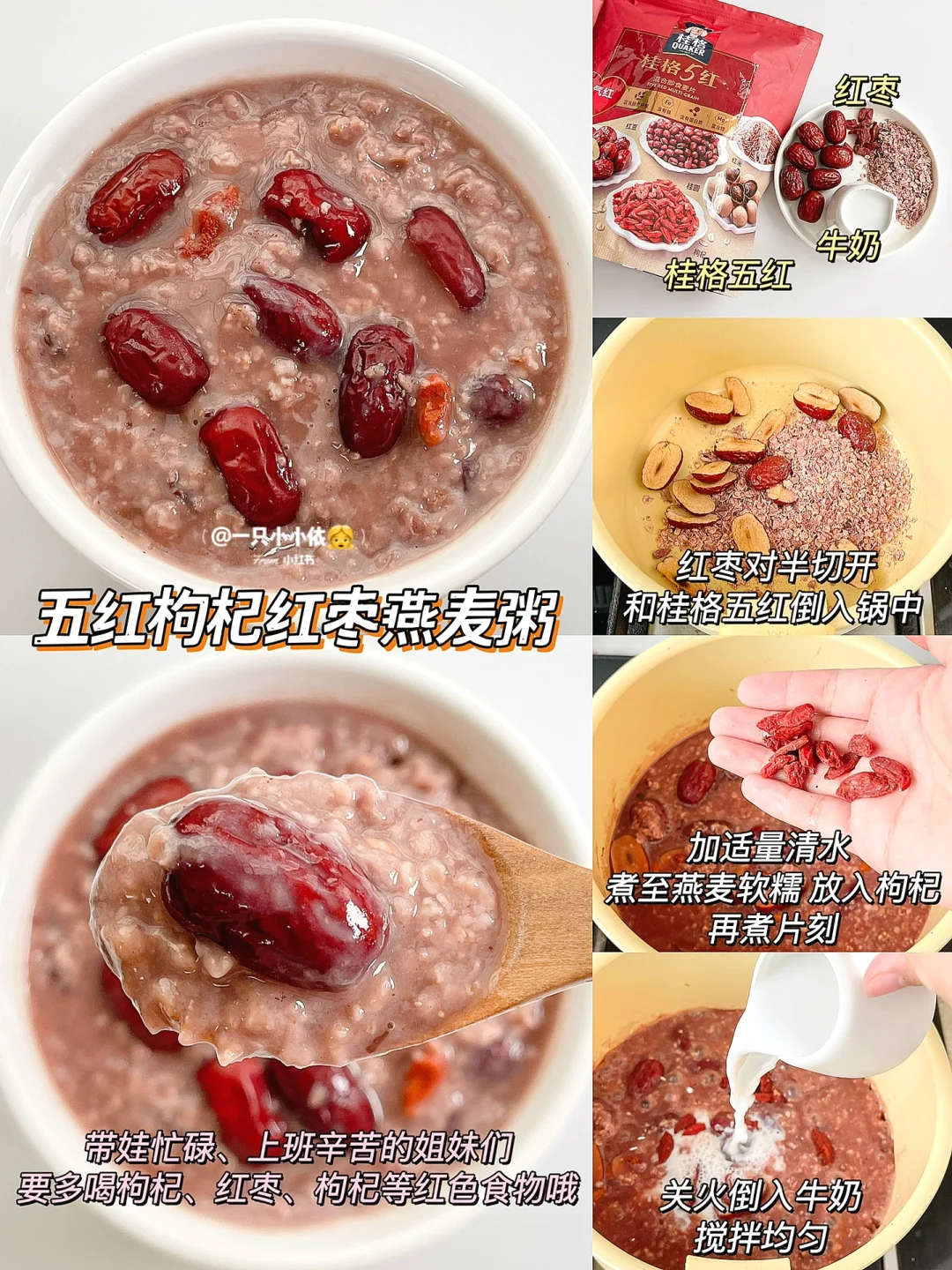 🔹步骤:红枣对半切开,和桂格五红倒入锅中;加适量清水,煮至燕麦软糯,放入枸杞,再煮片刻;关火倒入牛奶搅拌均匀