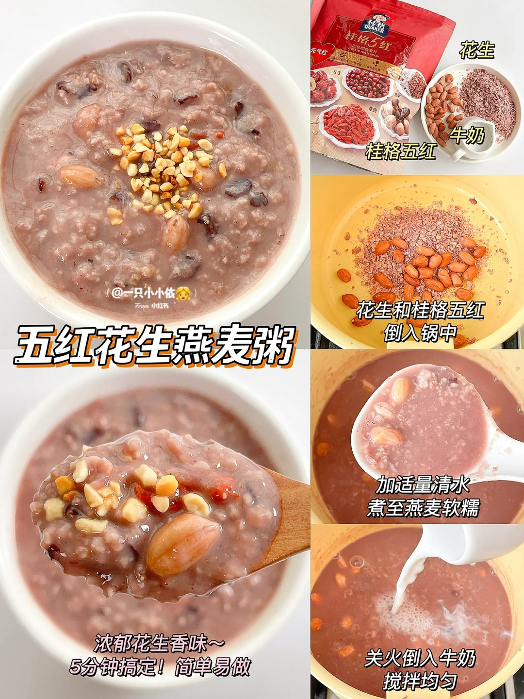 🔹步骤:花生和桂格五红倒入锅中;加适量清水,煮至燕麦软糯;关火倒入牛奶,搅拌均匀