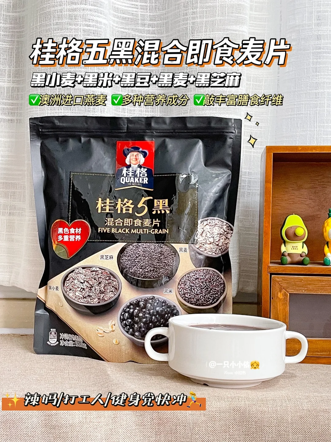 👉最近工作特别忙,早上都是吃桂格五黑,3分钟煮好,用热水、热牛奶也能轻松泡开,软糯香甜,饱腹感十足😄它用的都是澳洲进口燕麦,里面有黑小麦、黑米、黑豆、黑麦、黑芝麻5种黑色食材,富含膳食纤维,还没有额外添加蔗糖,身材管理的姐妹也不用担心啦![赞R]
