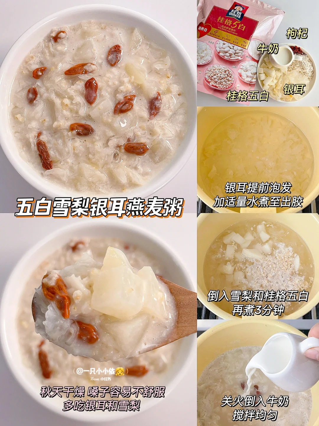 🔹步骤:银耳提前泡发,加适量水煮至出胶;倒入雪梨和桂格五白,再煮3分钟;关火倒入牛奶,搅拌均匀