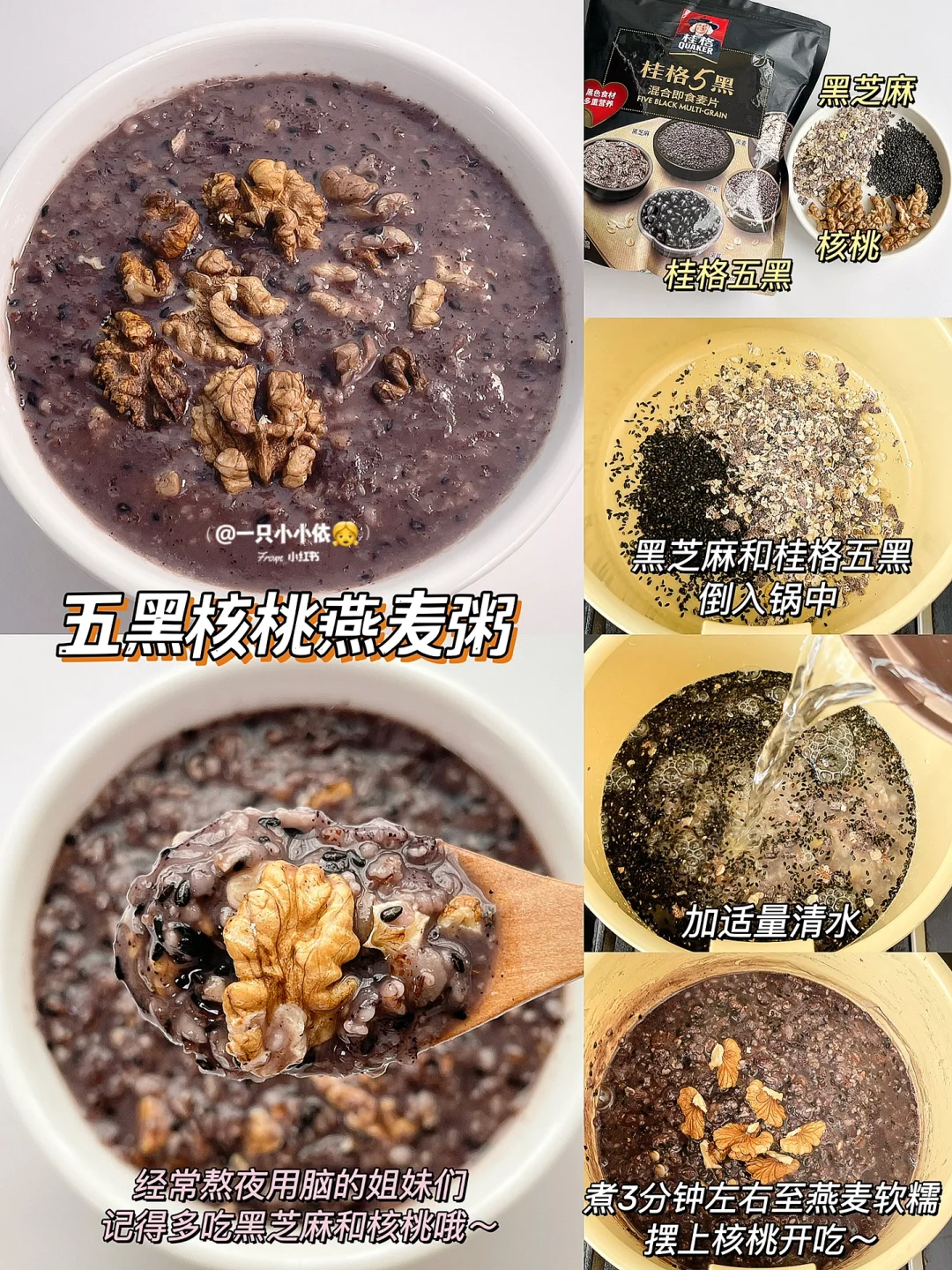 🔹步骤:黑芝麻和桂格五黑倒入锅中;加适量清水;煮3分钟左右至燕麦软糯,摆上核桃开吃~