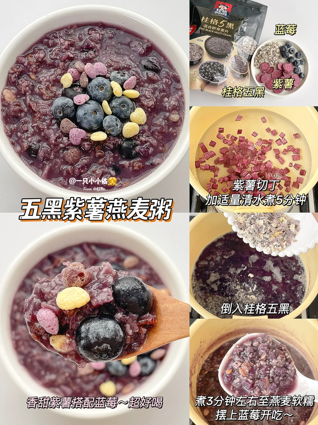 🔹步骤:紫薯切丁,加适量清水煮5分钟;倒入桂格五黑;煮3分钟左右至燕麦软糯,摆上蓝莓开吃~