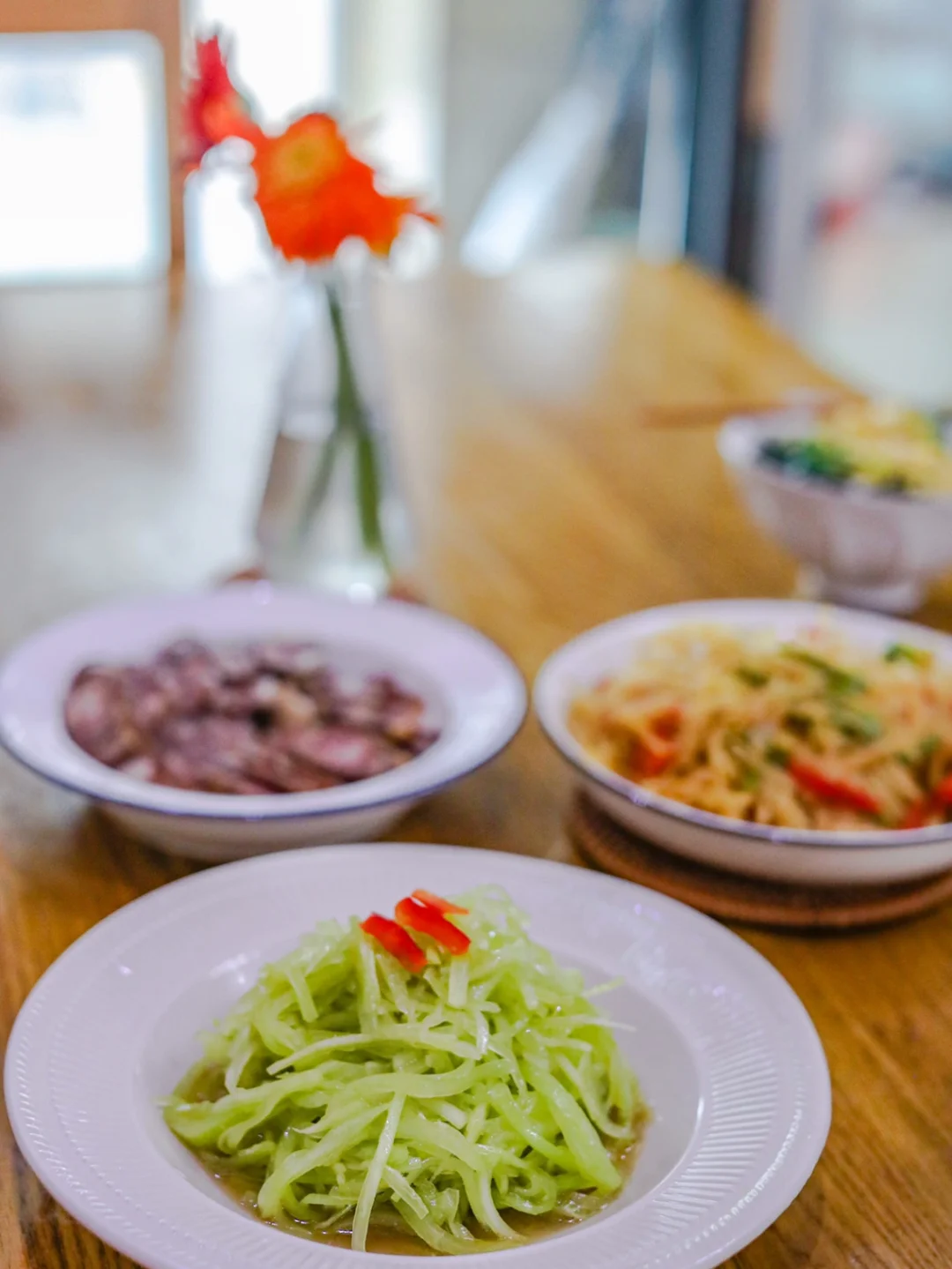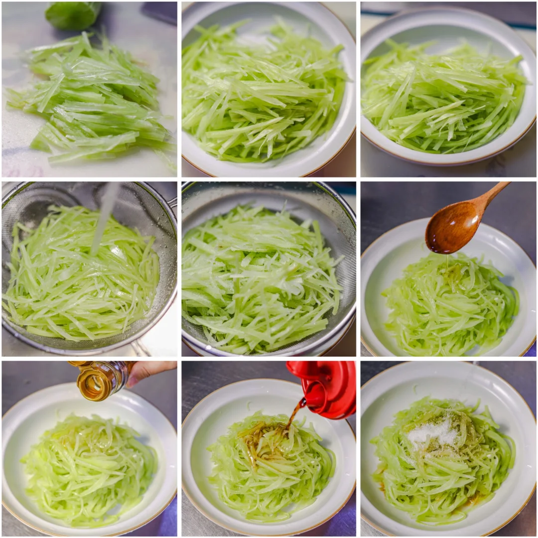 凉拌莴苣丝 🌈三月的胶东半岛,春天已经占据每寸光阴和角落。和春天有关的时令美食和大自然中的花草悄然上市。花骨朵逐渐露出头角,小草慢慢回青。 🌈今天迎来了春天的第一场雨,空气格外清新。雨整整下了一天,到现在还没停,小朋友今天过足了瘾,踩水,踩泥坑,莫大的快乐和幸福。 🌈春日里这样的好时光,就要到阳光里,草地上,田埂上去,现在因为疫情的原因,春天都放慢了脚步,哪也不能去。 🌈不能成行,不如就靠今天的这道凉拌莴苣丝,咬一口好春光吧~ 【食材】 新鲜莴苣350克 【调料】 香油—10克 葱油—10克 白糖—适量 味精—适量 食盐—15克 醋—适量 辣椒油—适量(根据自己喜好添加) 【做法】 ✨1.莴苣去皮,切丝。(凉拌莴苣千万不要用开水烫,将莴苣切丝后直接用冷水来回冲洗几遍即可) ✨2.将莴苣放入食盐,来回抓匀腌制10分钟,去掉多余的水分。 ✨3.放入容器中,加入葱油,香油,味精,白糖来回拌匀即可。