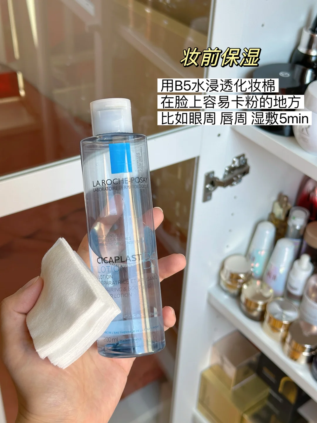 尤其是换季、爱干燥起皮的时候,用化妆棉浸透B5水,湿敷在眼周、唇周这些爱卡粉的地方,底子会变的贼润!爆皮都抚平了,后续上妆扒脸的很!粉卡不了一点