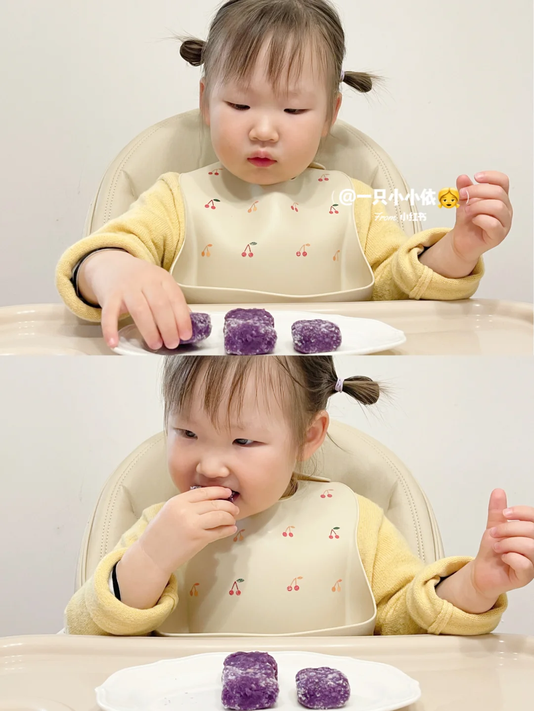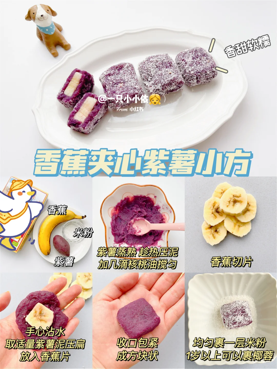 🔸做法:紫薯蒸熟趁热压泥,加几滴核桃油搅拌均匀;香蕉切片,手心沾水取适量紫薯泥压扁,放入香蕉片,收口包紧成方块状;均匀裹一层米粉(1岁以上可以裹椰蓉)