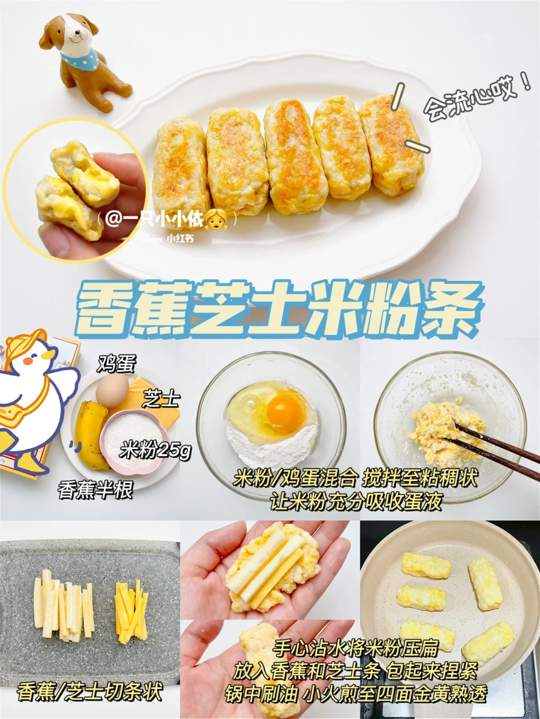 🔸做法:米粉、鸡蛋混合,搅拌至粘稠状,让米粉充分吸收蛋液;香蕉、芝士切条状;手心沾水将米粉压扁,放入香蕉和芝士条,包起来捏紧;锅中刷油,小火煎至四面金黄熟透