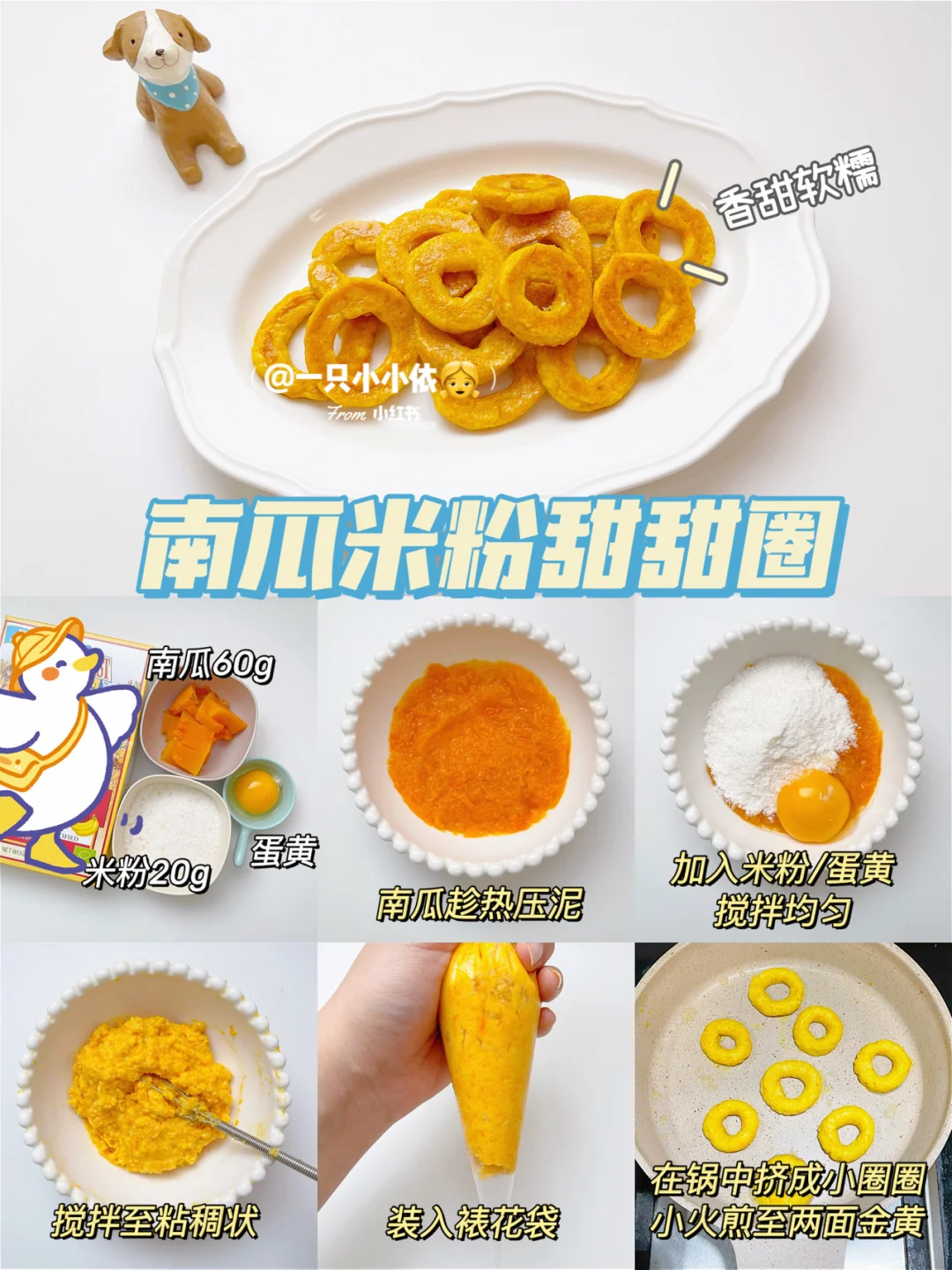 🔸做法:南瓜蒸熟趁热压泥,加入米粉、蛋黄搅拌至粘稠状,装入裱花袋;锅中刷油挤成小圈圈,小火煎至两面金黄