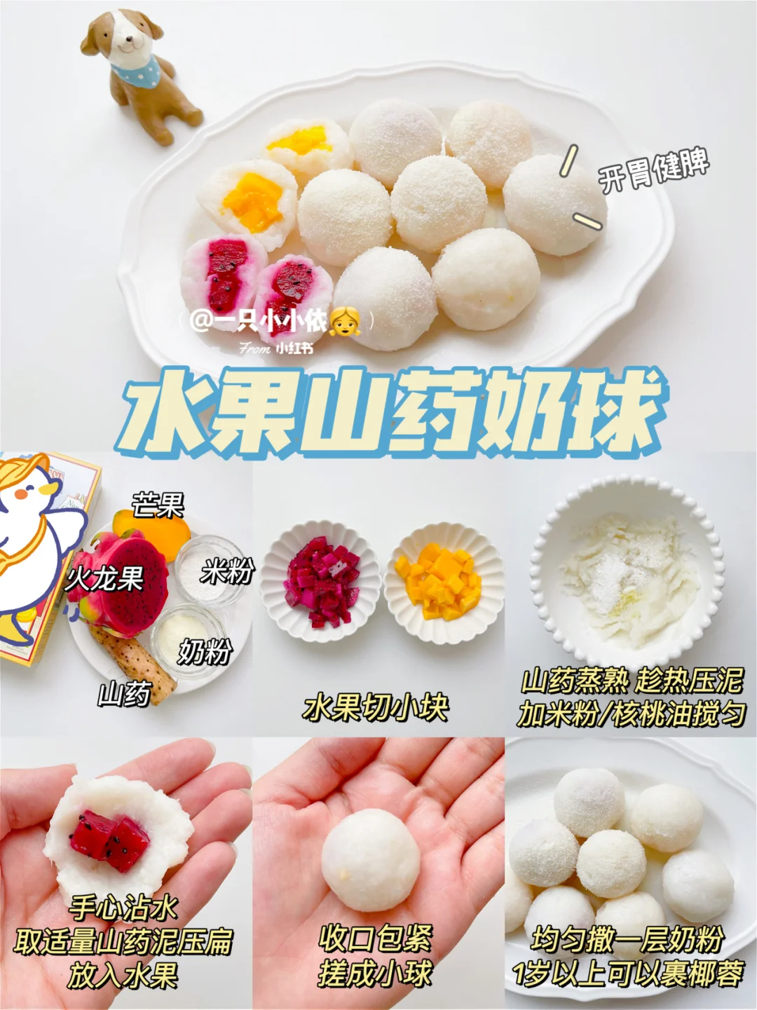 🔸做法:水果切小块,山药蒸熟趁热压泥,加米粉和核桃油搅拌均匀;手心沾水取适量山药泥压扁,放入水果,收口包紧搓成小球;均匀撒一层奶粉(1岁以上可以裹椰蓉)