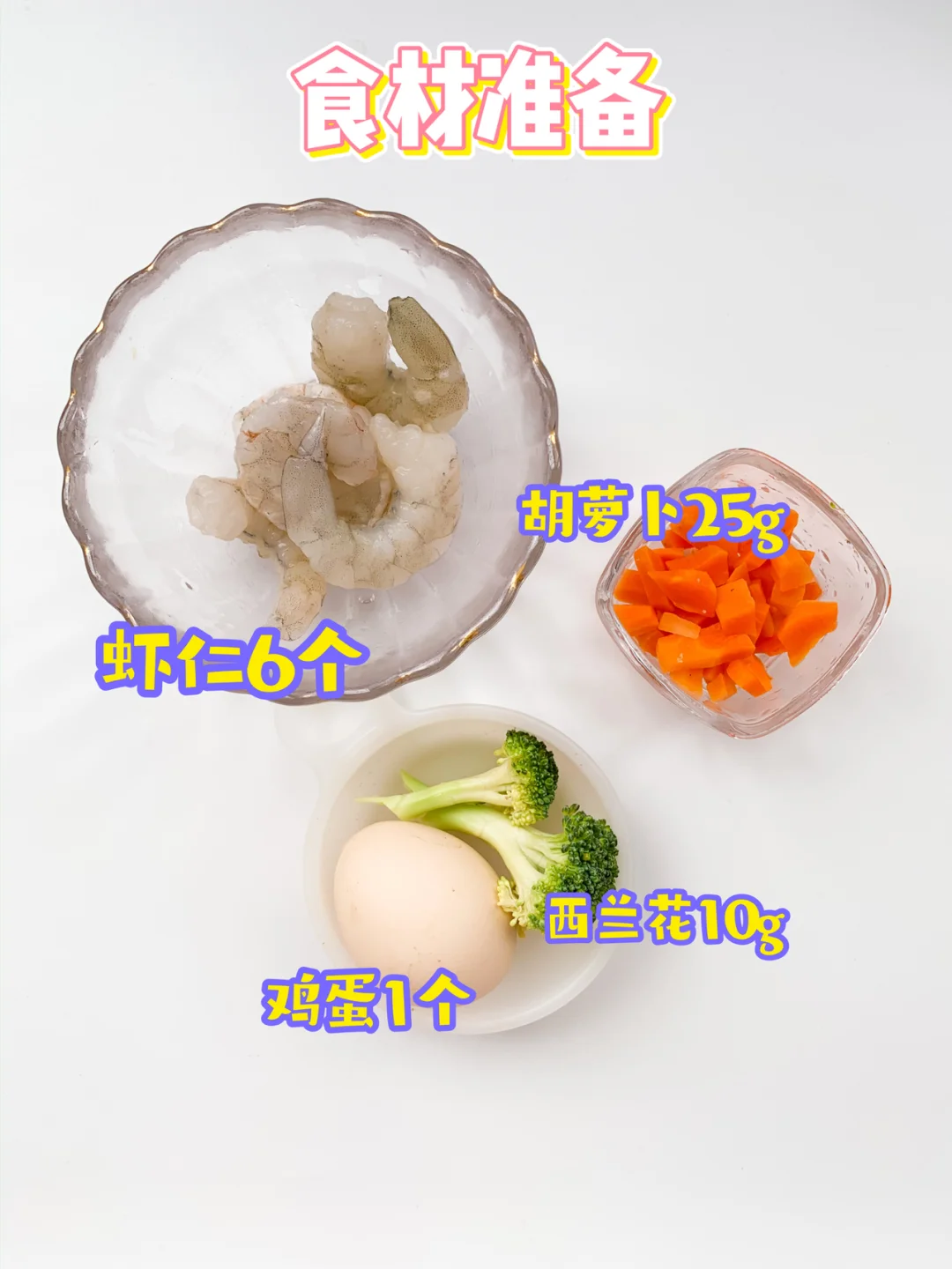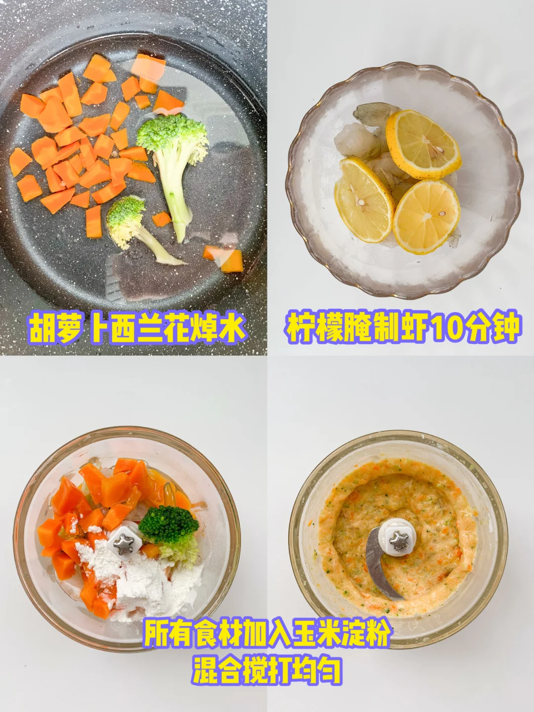 1️⃣虾去鲜虾柠檬腌制10分钟,胡萝卜西兰花焯水;