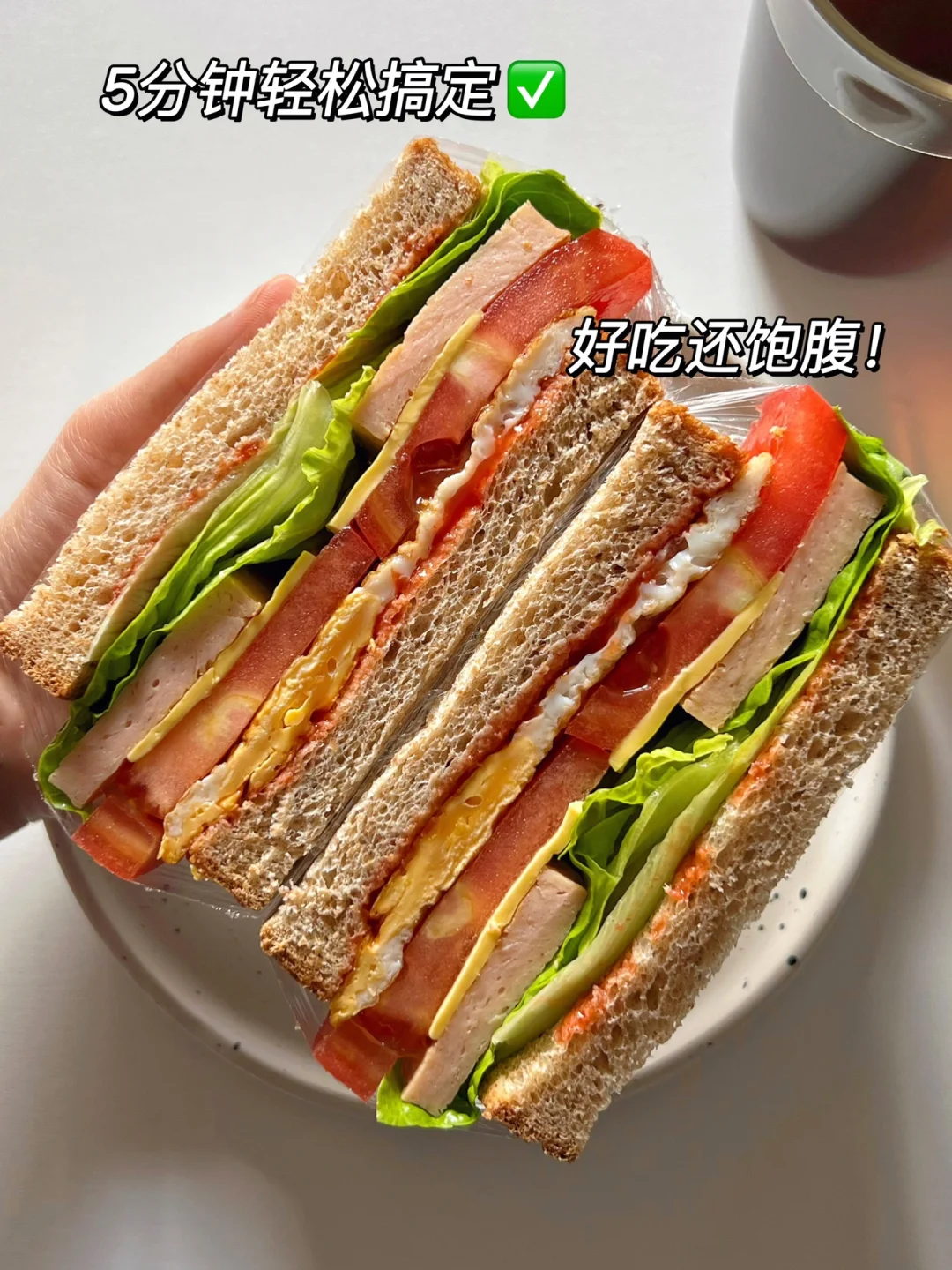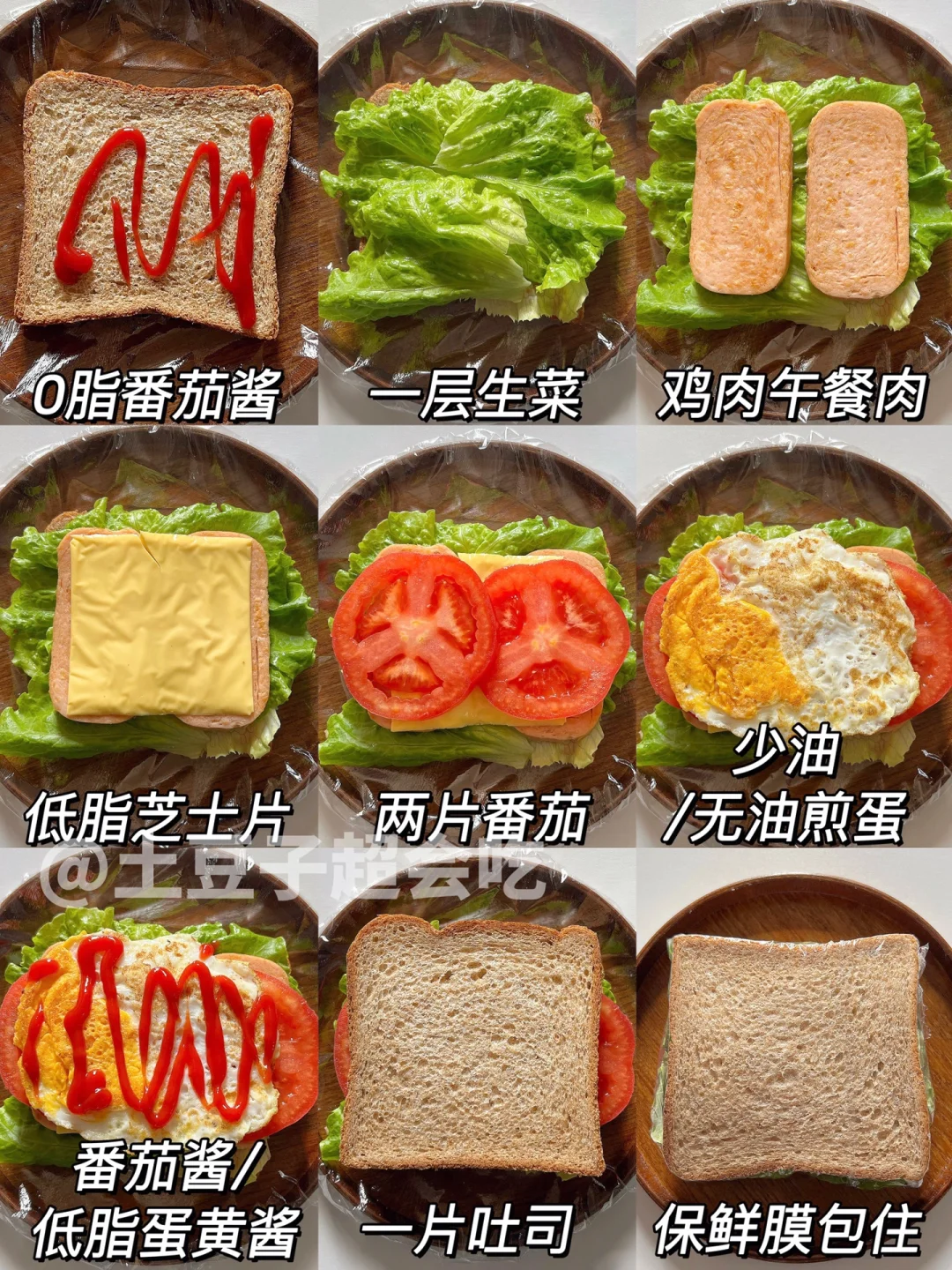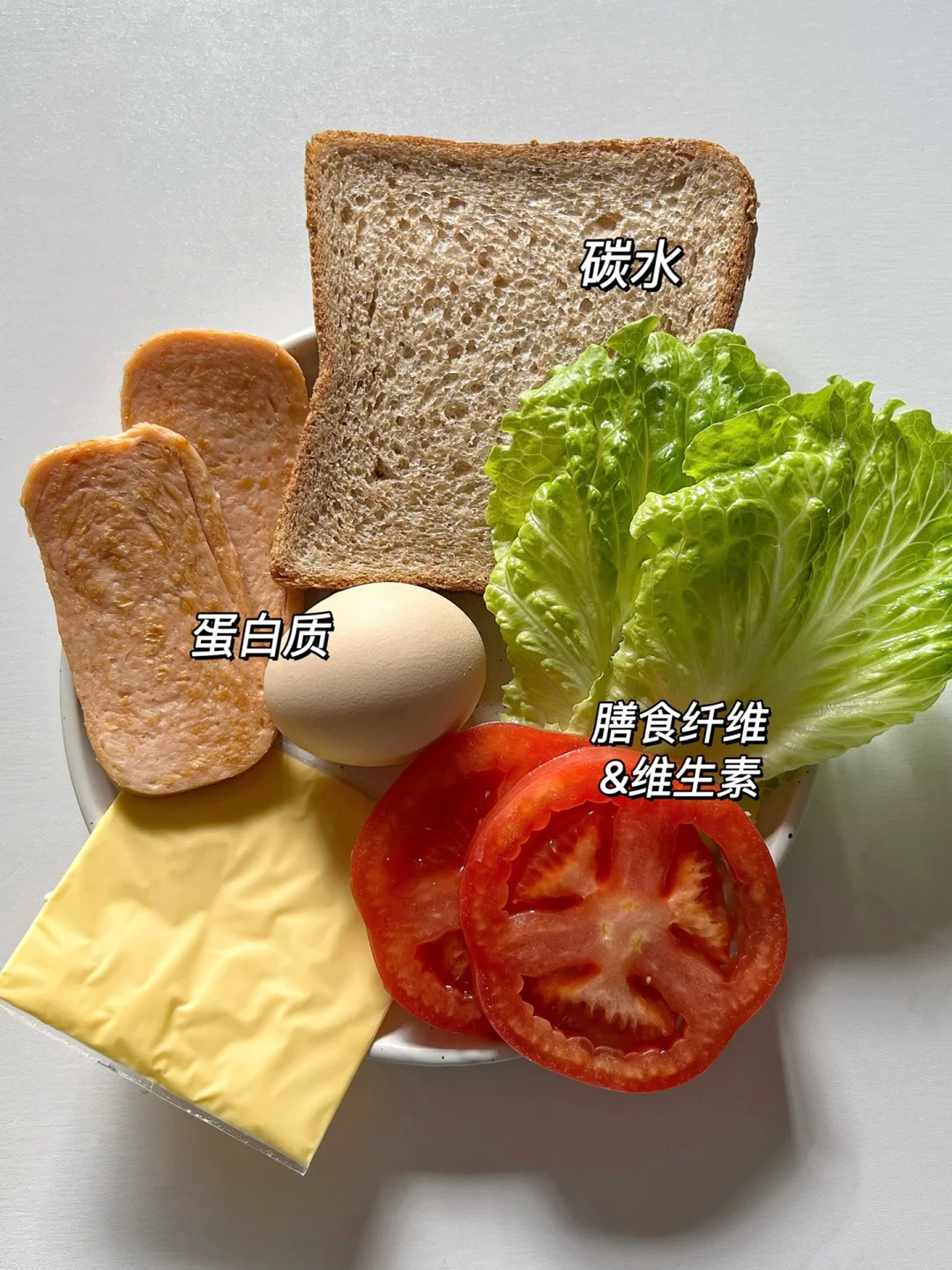 🍅 食材准备:全麦吐司、番茄、生菜、鸡蛋、鸡肉午餐肉、低.脂芝士片、0.脂番茄酱/低.脂蛋黄酱