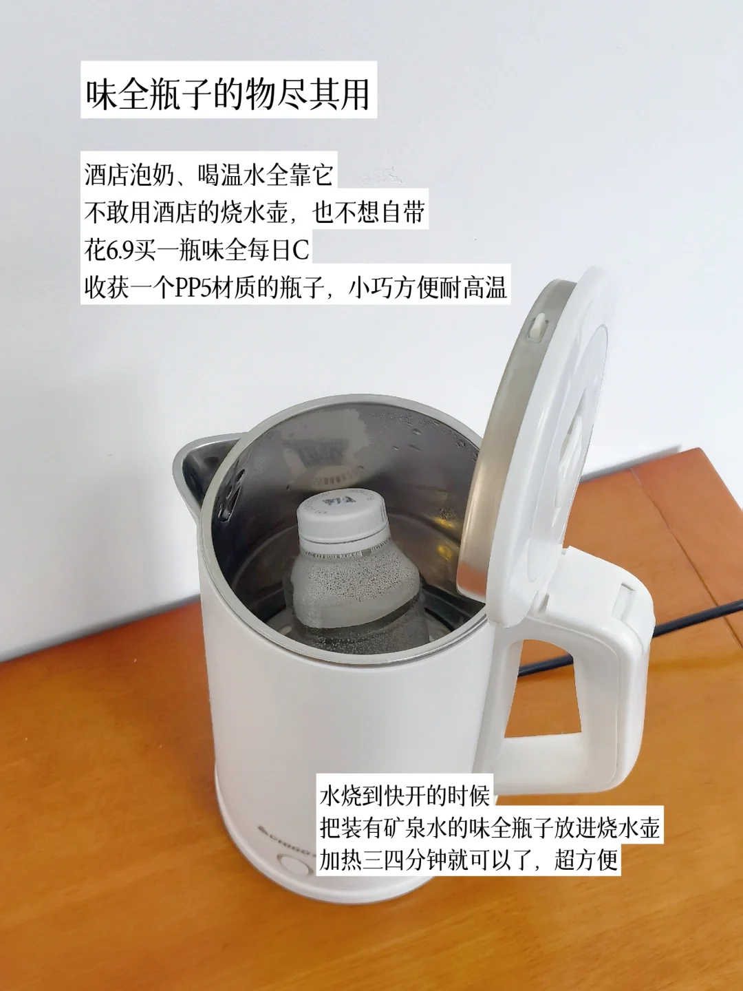 把装有矿泉水的味全瓶子放进去加热三四分钟左右就可以了,超方便