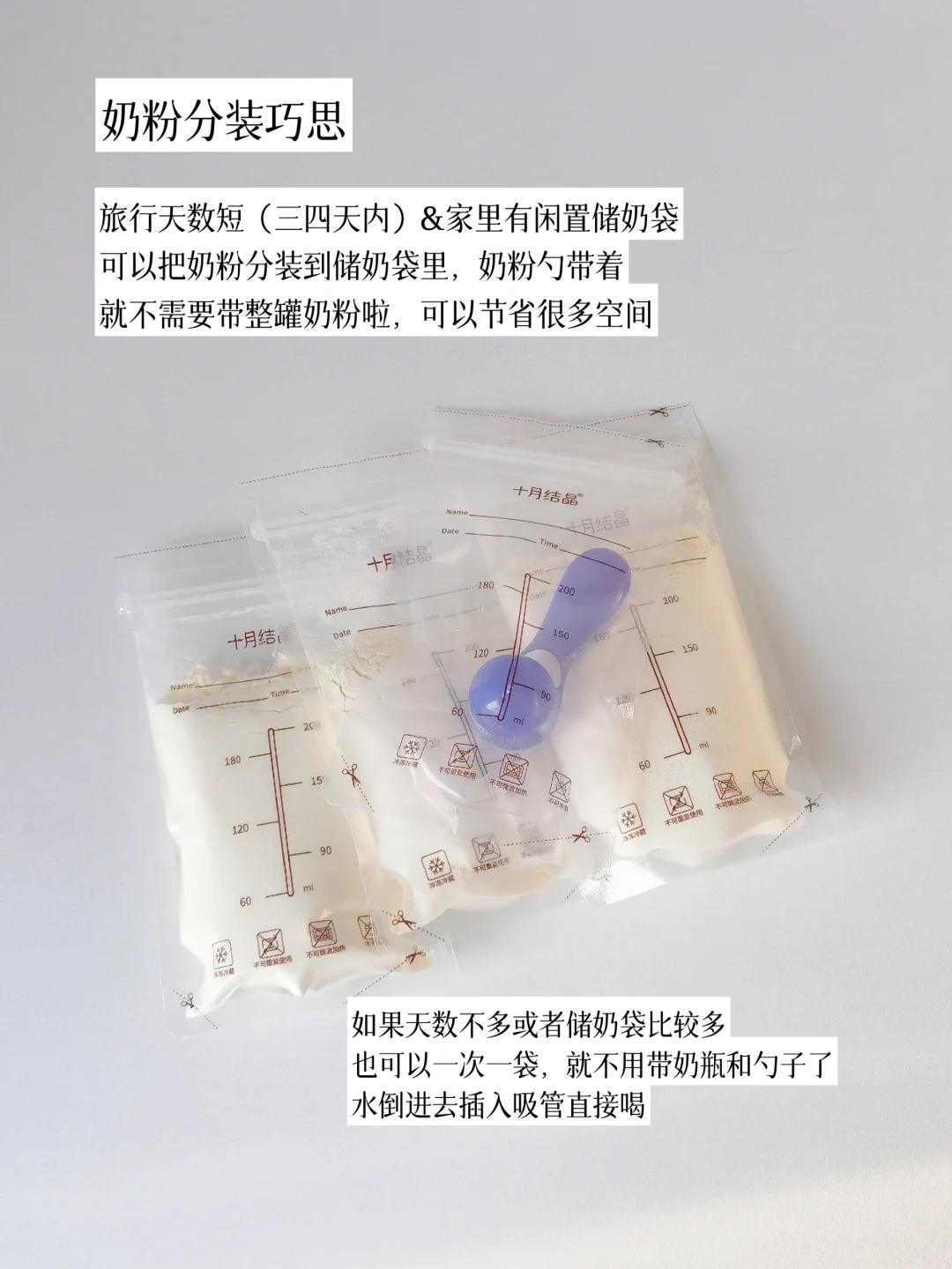 可以把奶粉分装到储奶袋里,奶粉勺带着