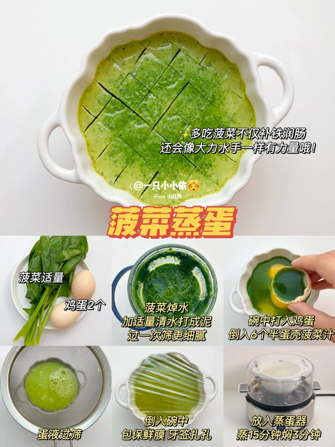 🔹步骤:菠菜焯水,加适量清水打成泥(过筛更细腻);碗中打入鸡蛋,倒入6个半蛋壳菠菜汁,蛋液过筛;倒入碗中,包保鲜膜,牙签扎孔;放入煮蛋器,蒸15分钟焖3分钟