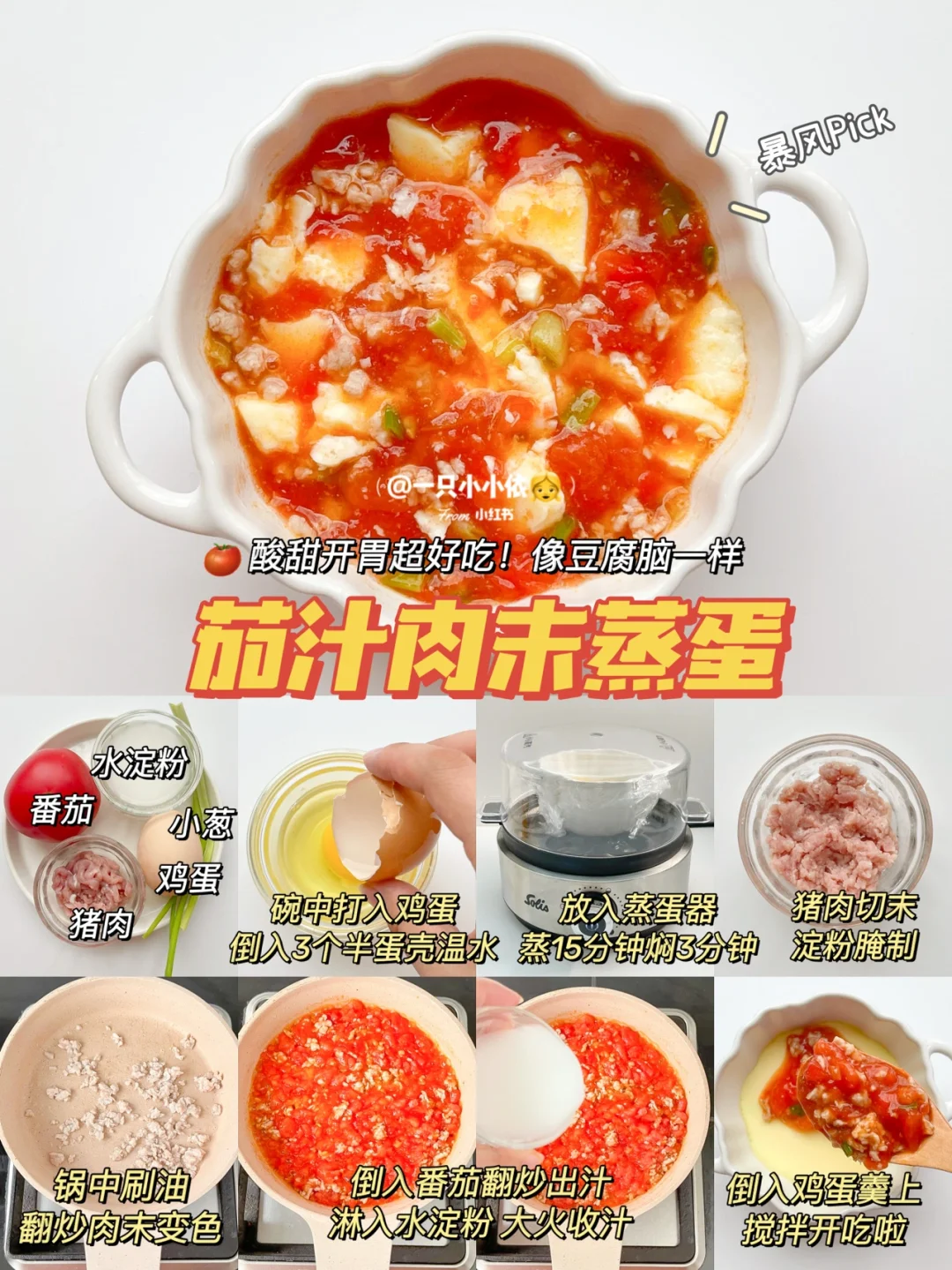 🔹步骤:碗中打入鸡蛋,倒入3个半蛋温水,放入煮蛋器,蒸15分钟焖3分钟备用;猪肉切末淀粉腌制;锅中刷油,翻炒肉末变色,倒入番茄翻炒出汁,淋入水淀粉大火收汁;倒入鸡蛋羹上搅拌开吃啦