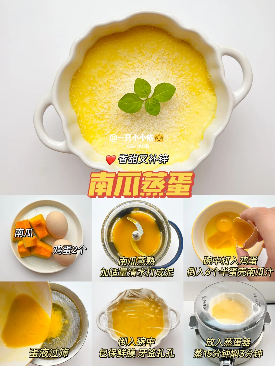 🔹步骤:南瓜蒸熟,加适量清水打成泥;碗中打入鸡蛋,倒入6个半蛋南瓜汁,蛋液过筛;倒入碗中,包保鲜膜,牙签扎孔;放入煮蛋器,蒸15分钟焖3分钟