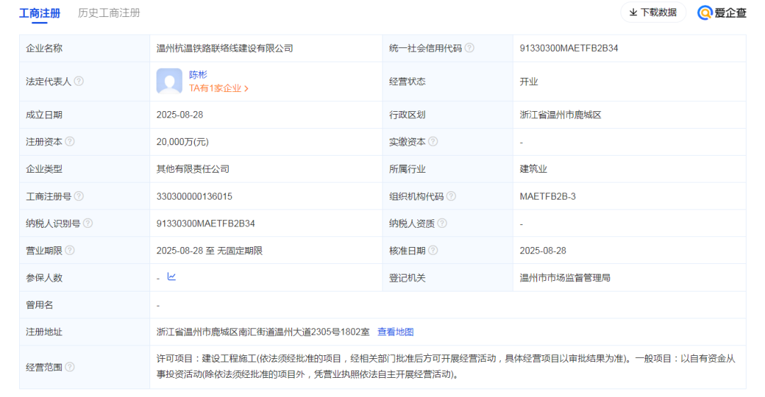 近日,温州杭温铁路联络线建设有限公司成立,注册资本2亿元。