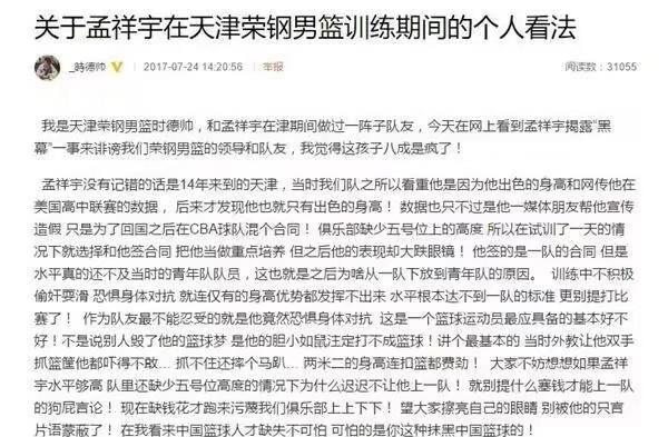 孟祥宇说偷窃队友手机是子虚乌有的事情,所以他也不会进行回应。 他还说过天津男篮俱乐部因他谈恋爱和需要观察为由克扣了他20余万工资,后来又声明天津篮球俱乐部和他本人没有任何工资,训练费等方面的经济及其他一切法律纠纷。 天津男篮球员时德帅关于孟祥宇在天津男篮训练期间的看法中写到,孟祥宇因为缺钱花污蔑我们俱乐部上上下下,这孩子八成是疯了。 那么问题来了,如果他不是因为偷窃队友手机,那么为什么辽篮青训要把他开除了? 你品,你细品! #孟祥宇分析# #天津男篮# #时德帅# #球员孟祥宇为何招人讨厌?# #天津篮协回应孟祥宇举报# #如何看待孟祥宇抹黑辽篮俱乐部# #天赋异禀的孟祥宇为啥无球可打?#