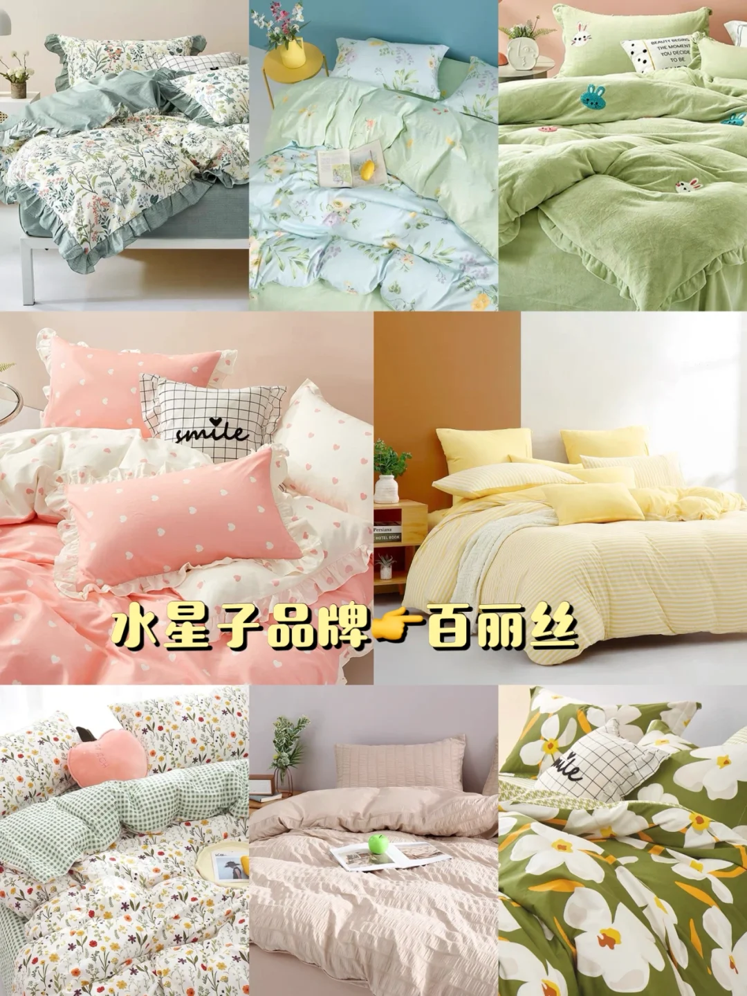 水星家纺的子品牌,水星是国内家纺的上市公司,自然靠谱些,百丽丝全品类都卖,枕头被子四件套都有,风格小清新简约风,用料没有主品牌那么高配,但是性价比足够~比杂牌靠谱很多[微笑R]