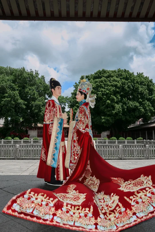 传统婚服与古建筑交织出浓墨重彩的画卷。