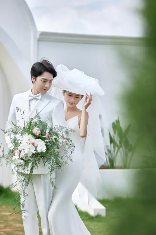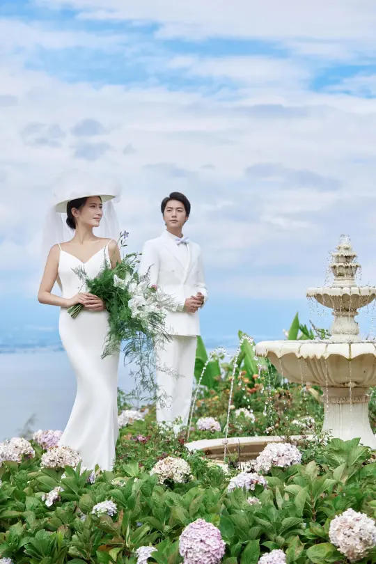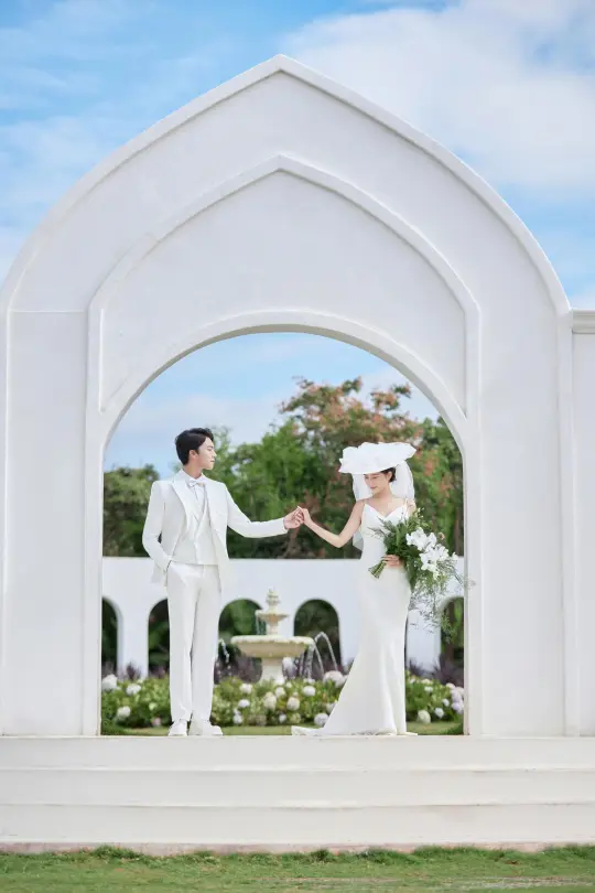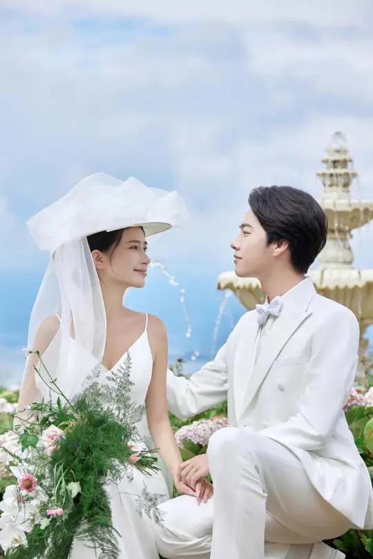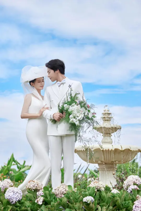 蓝天白云下,白色婚纱和西装好搭,手里的花束也很清新,还有复古的喷泉,像把爱情里最美好的模样都定格住了。 这组婚纱照,每次看都觉得幸福感要溢出来啦~