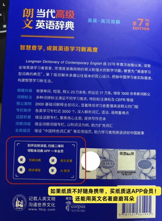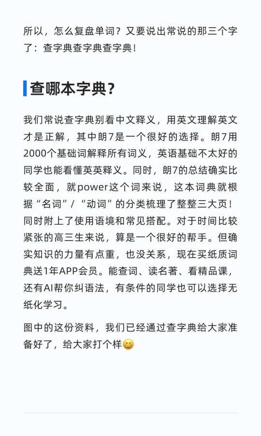 我们常说查字典别看中文释义,用英文理解英文才是正解,其中朗7是一个很好的选择。朗7用2000个基础词解释所有词义,英语基础不太好的同学也能看懂英英释义。同时,朗7的总结确实比较全面,就power这个词来说,这本词典就根据“名词”/ “动词”的分类梳理了整整三大页!同时附上了使用语境和常见搭配。对于时间比较紧张的高三生来说,算是一个很好的帮手。但确实知识的力量有点重,也没关系,现在买纸质词典送1年APP会员。能查词、读名著、看精品课,还有AI帮你纠语法,有条件的同学也可以选择无纸化学习。