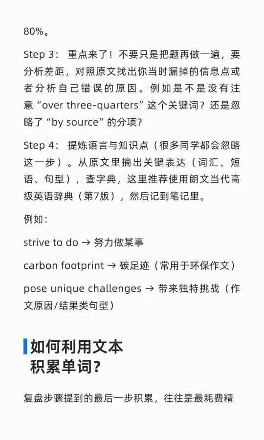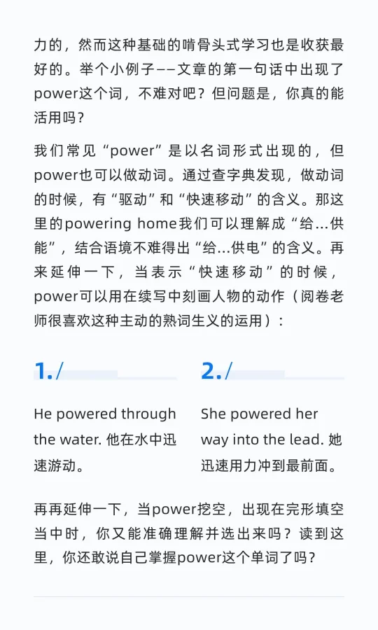很多同学认为A篇闭着眼也能做,复盘的时候总是忽视。但你真的会复盘吗?举个小例子——文章的第一句话中出现了power这个词,不难对吧?但问题是,你真的能活用吗?