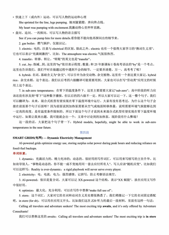 我们常见“power”是以名词形式出现的,但power也可以做动词。通过查字典发现,做动词的时候,有“驱动”和“快速移动”的含义。那这里的powering home我们可以理解成“给...供能”,结合语境不难得出“给...供电”的含义。再来延伸一下,当表示“快速移动”的时候,power可以用在续写中刻画人物的动作(阅卷老师很喜欢这种主动的熟词生义的运用):