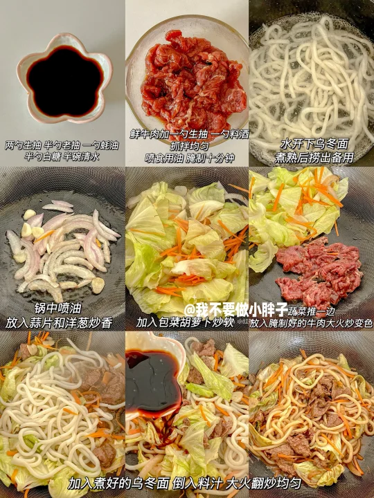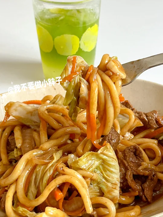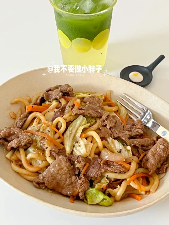 - 🍵 抹茶柚子 🥢 低卡牛肉炒乌冬面 - 📝食材: 乌冬面|牛肉|包菜|胡萝卜|洋葱 📝做法: ① 料汁:两勺生抽 半勺老抽 一勺蚝油 半勺白糖 半碗清水 ② 鲜牛肉加一勺生抽 一勺料酒搅拌均匀后喷食用油腌制十分钟 ③ 水开下乌冬面 煮熟后捞出备用 ④ 锅中喷油 加入蒜片和洋葱炒香 加入包菜胡萝丝炒软后推至一边放入腌制好的牛肉大火炒至变色 ⑤ 加入煮好的乌冬面 倒入料汁 大火翻炒均匀即可