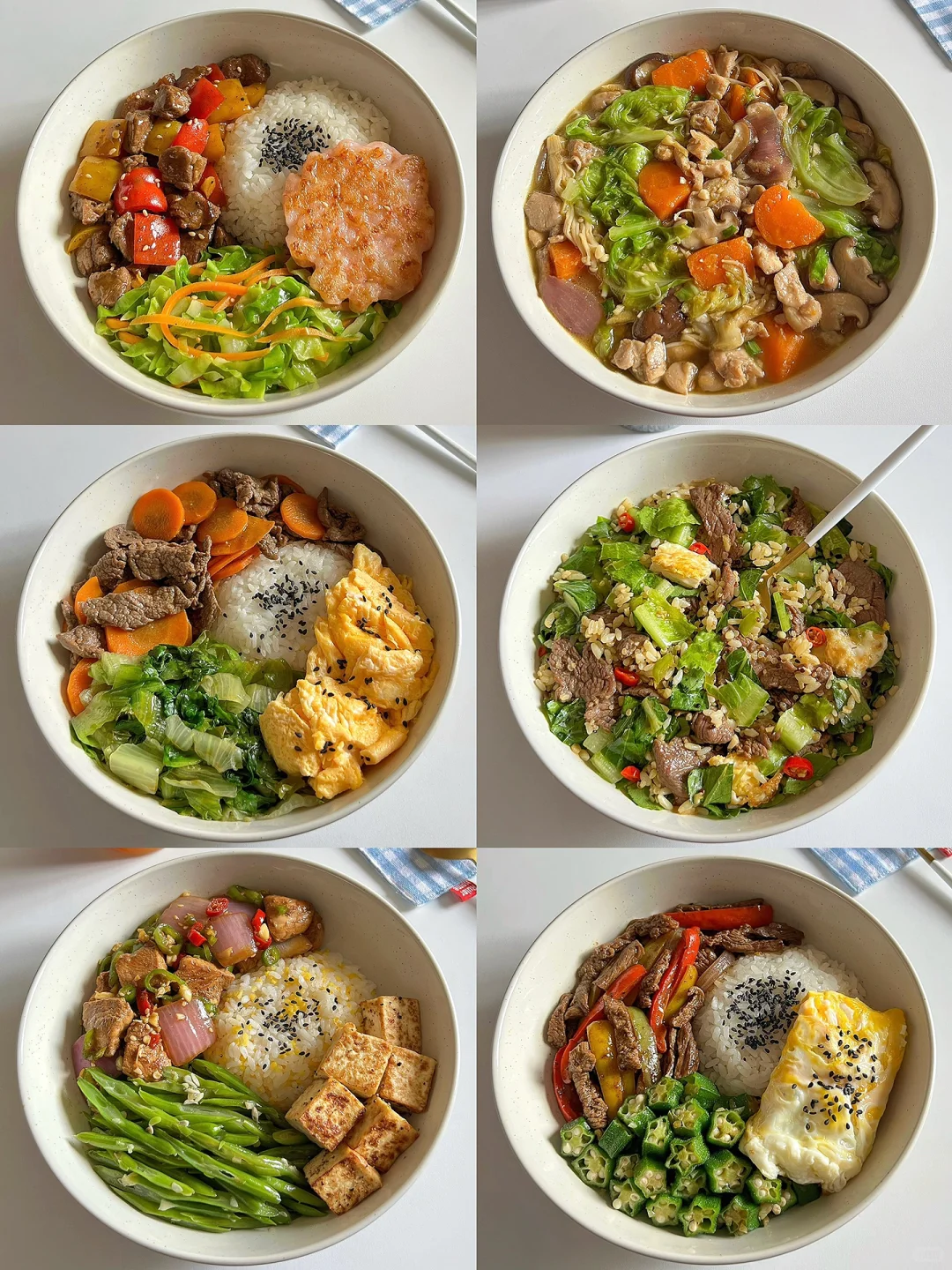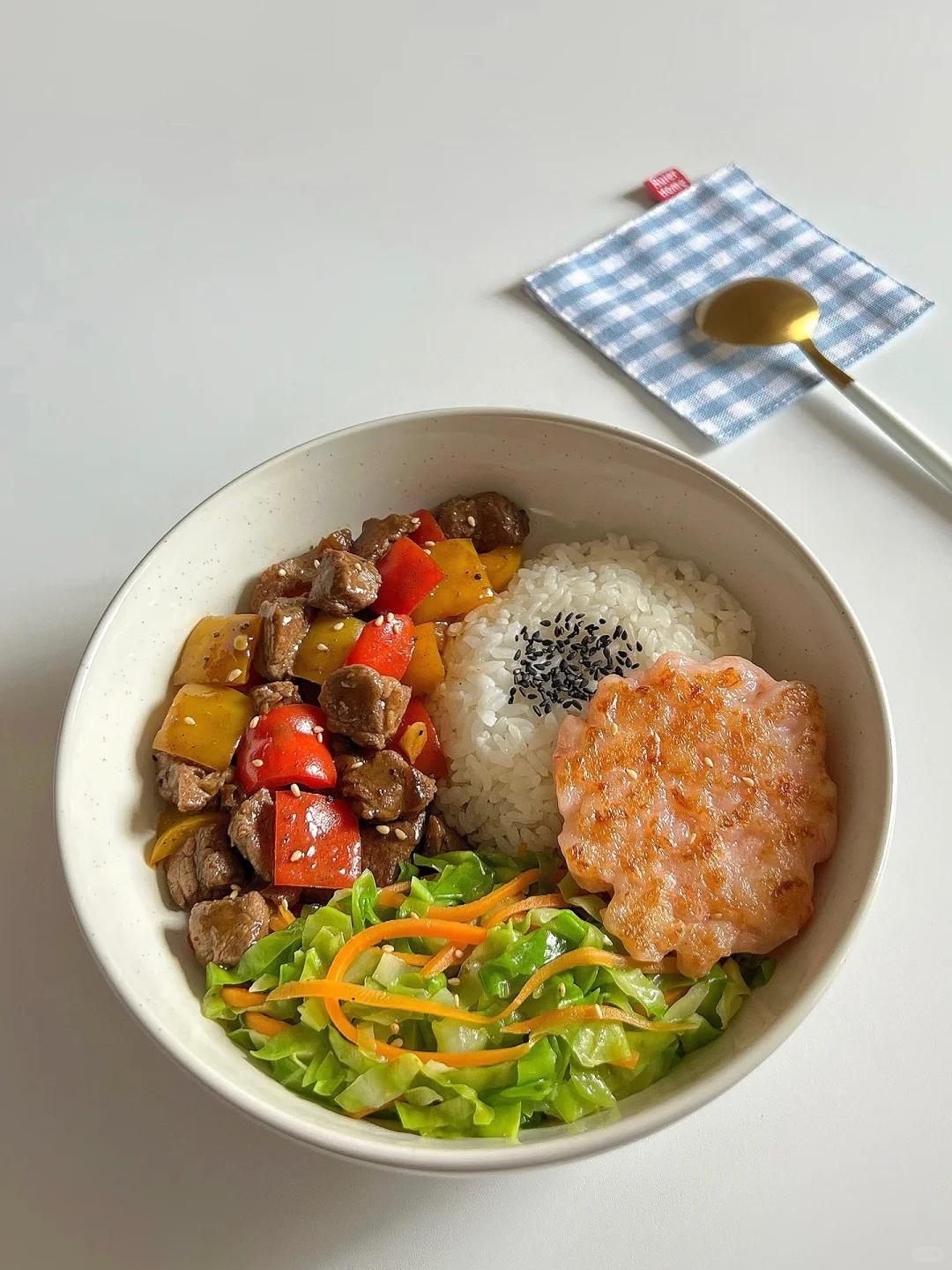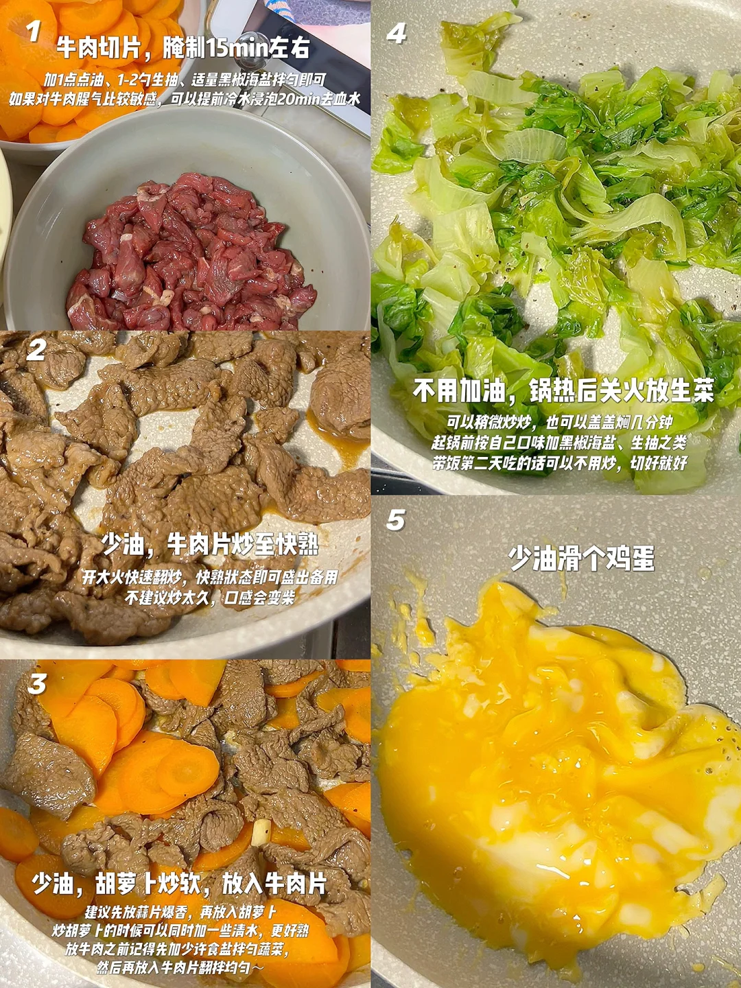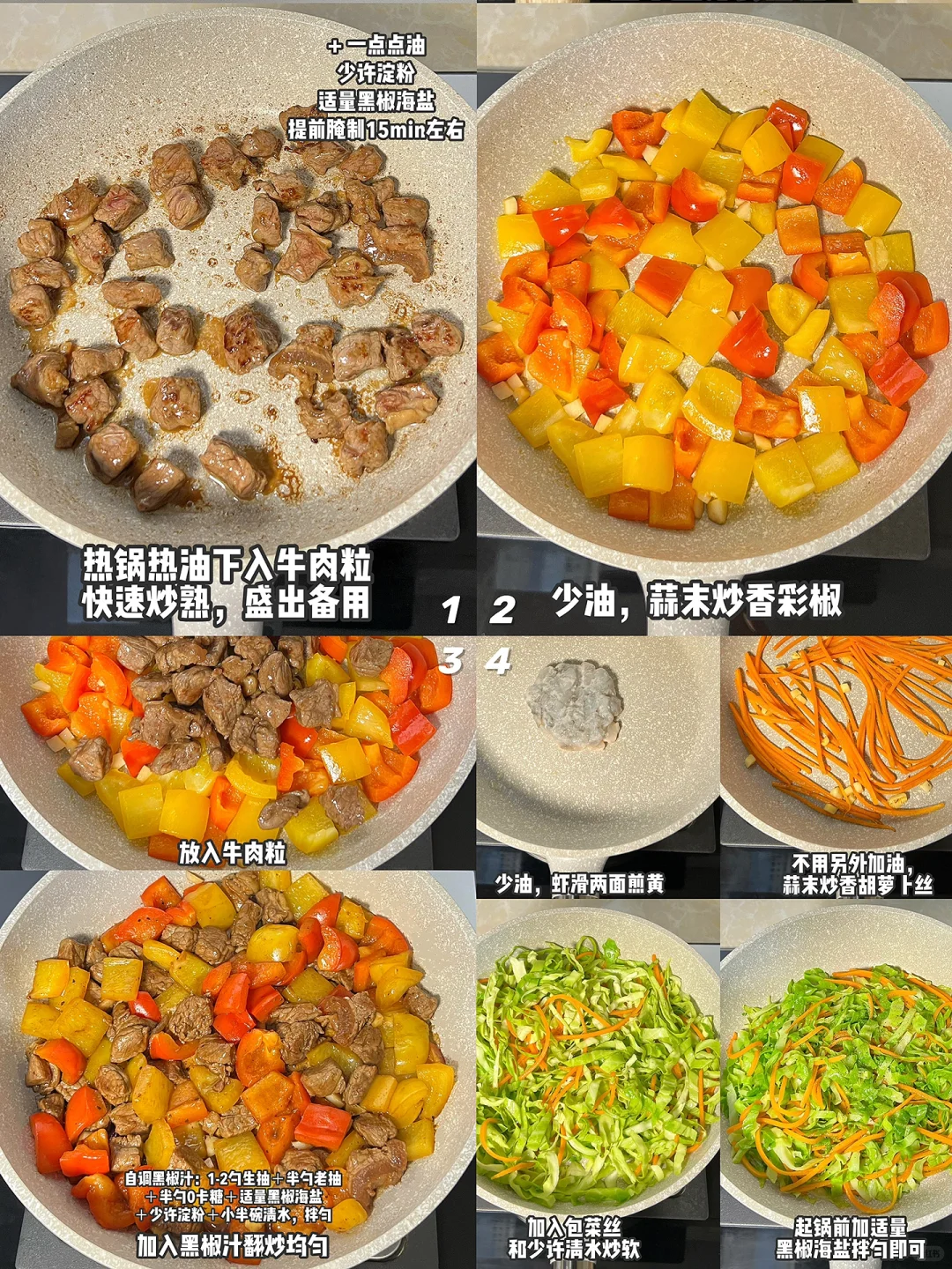 周1⃣️ 彩椒牛肉粒➕包菜炒胡萝卜➕煎虾滑🍤