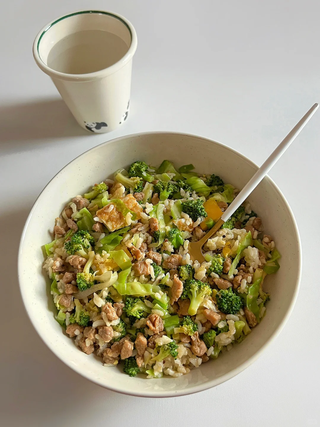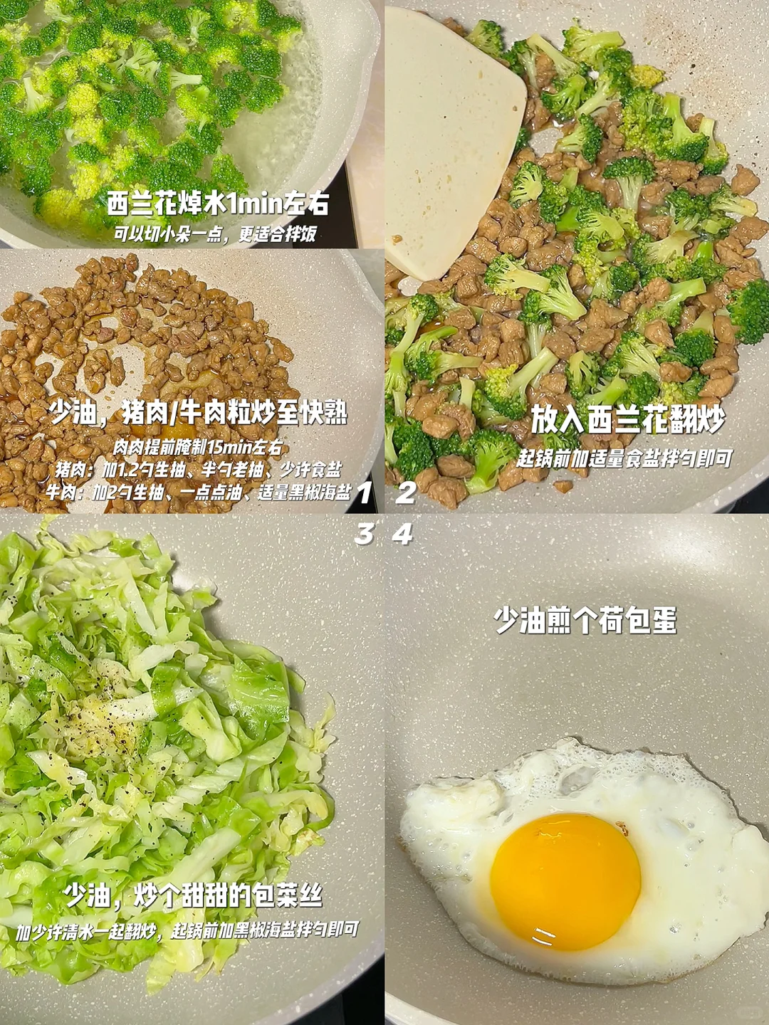周7⃣️ 西兰花炒肉粒➕包菜丝➕煎蛋拌饭🥦