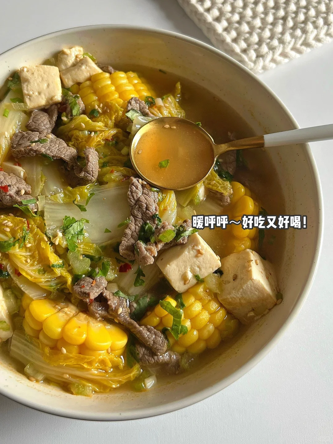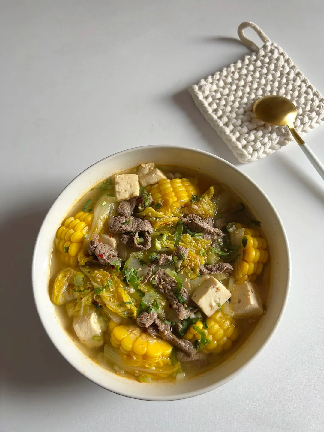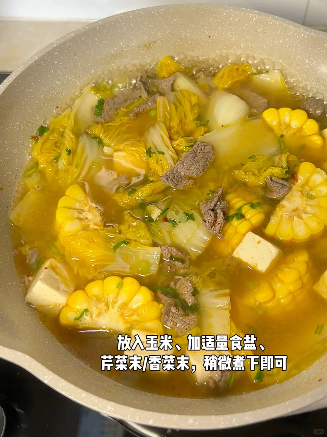 今天吃的是娃娃菜牛肉玉米汤🥣