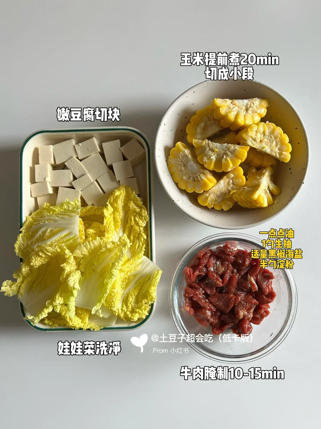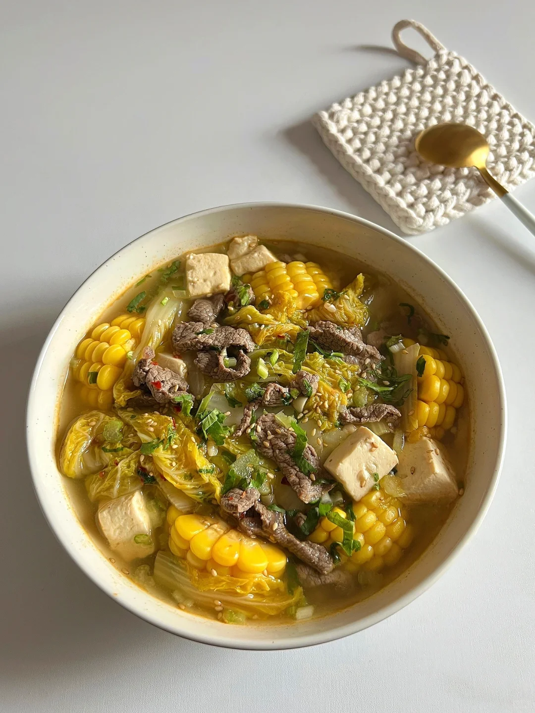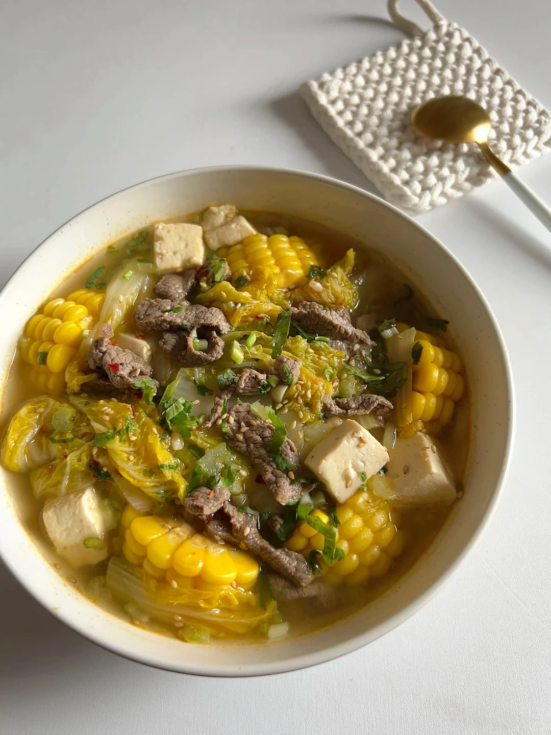 🥬 食材:甜玉米、牛里脊、嫩豆腐、娃娃菜、大蒜/香菜/香芹