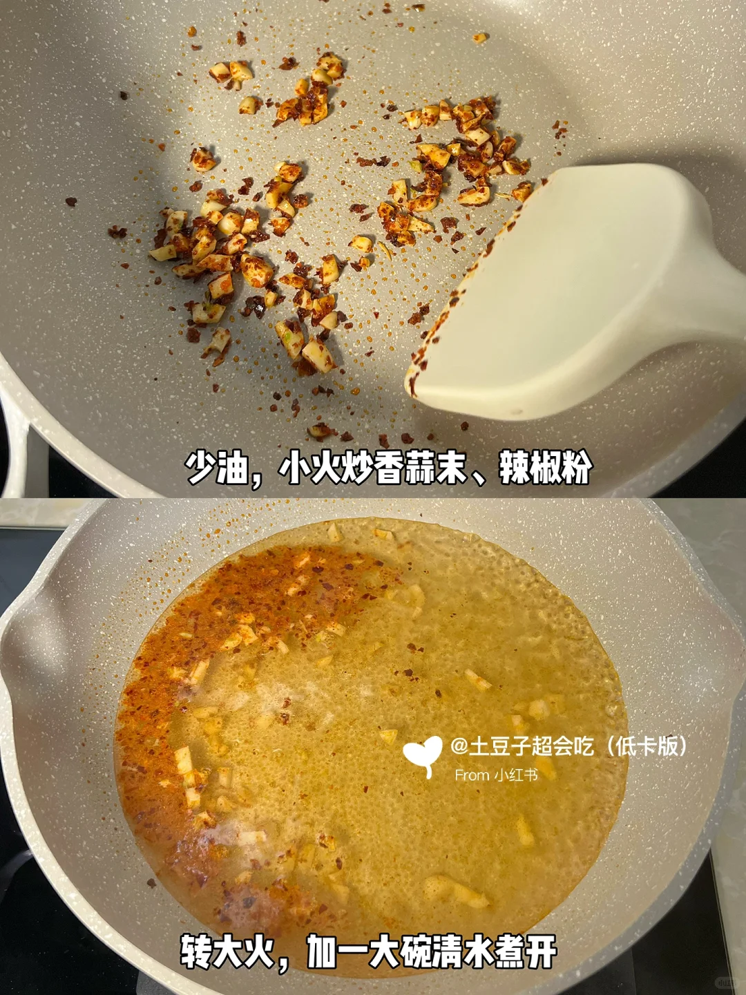 3⃣️ 锅中喷一点油,放蒜末和辣椒面炒香,再加入大碗清水煮开;