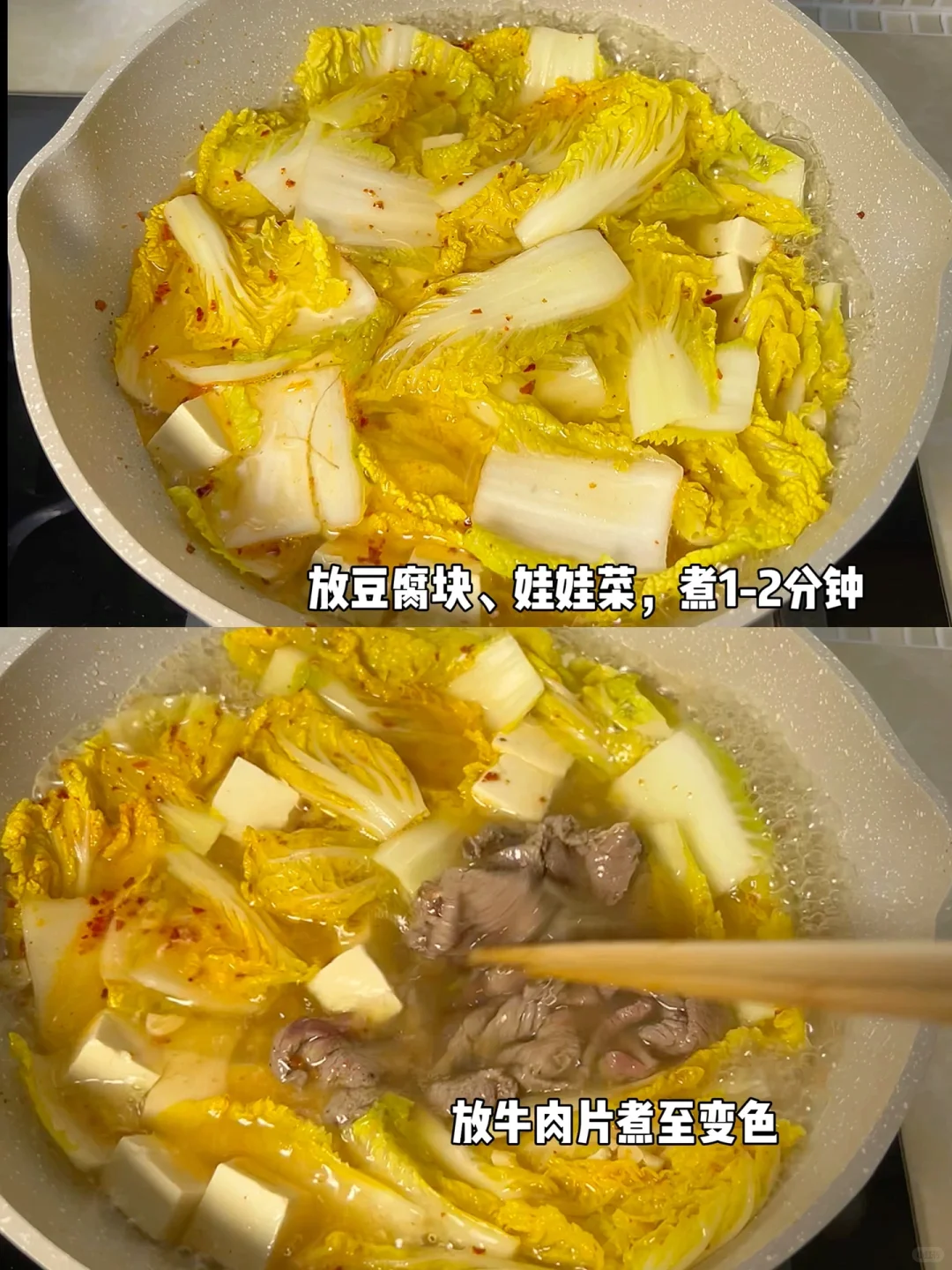 1)放娃娃菜和嫩豆腐煮1-2min;