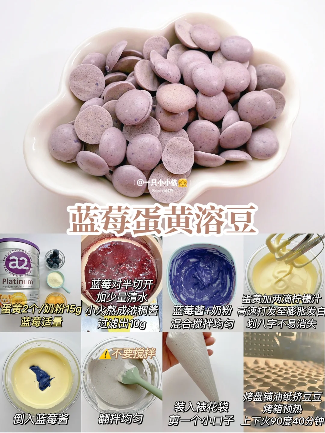 👉食材:蓝莓酱10g、蛋黄2个、奶粉15g