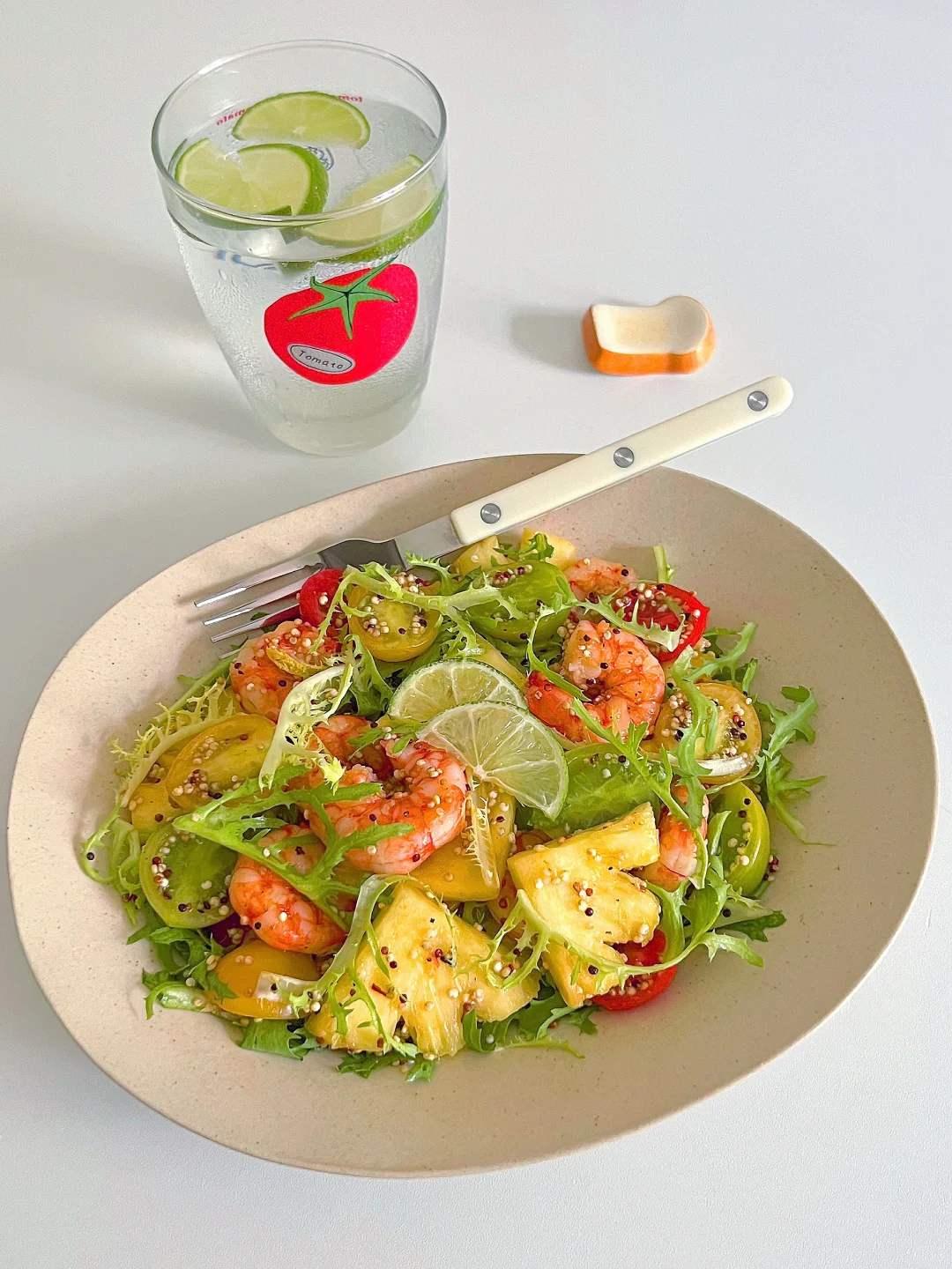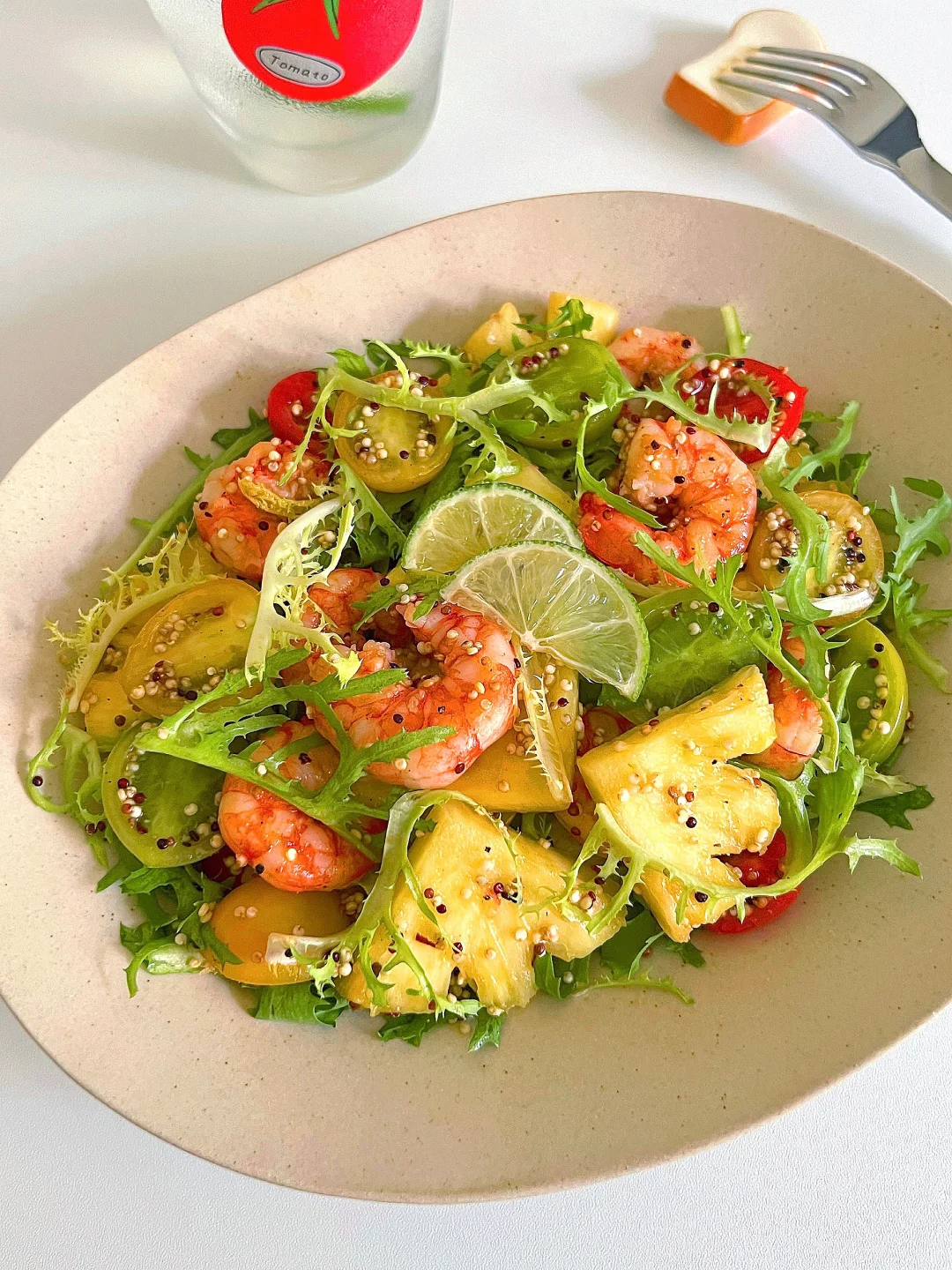 4⃣碗中苦菊、小番茄、凤梨、藜麦、虾仁,倒入沙拉汁,拌匀即可。