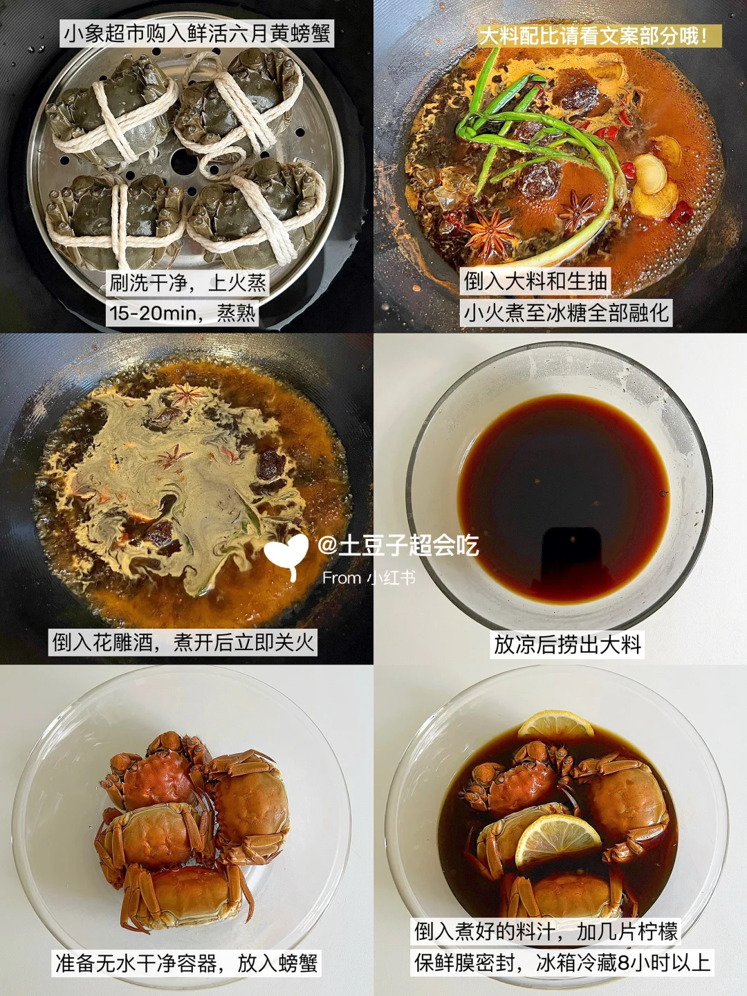 4只螃蟹所需:2颗八角、15-20颗花椒、70g冰糖、3颗话梅、1根小葱、4小片生姜、适量干辣椒、花雕酒300-350ml、生抽适量(看咸淡,一般300ml)、2片柠檬(去籽)
