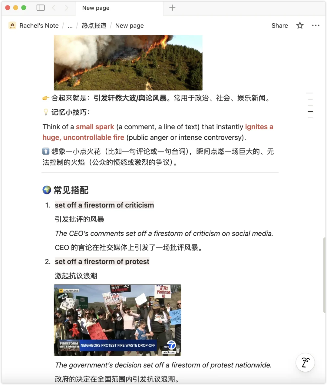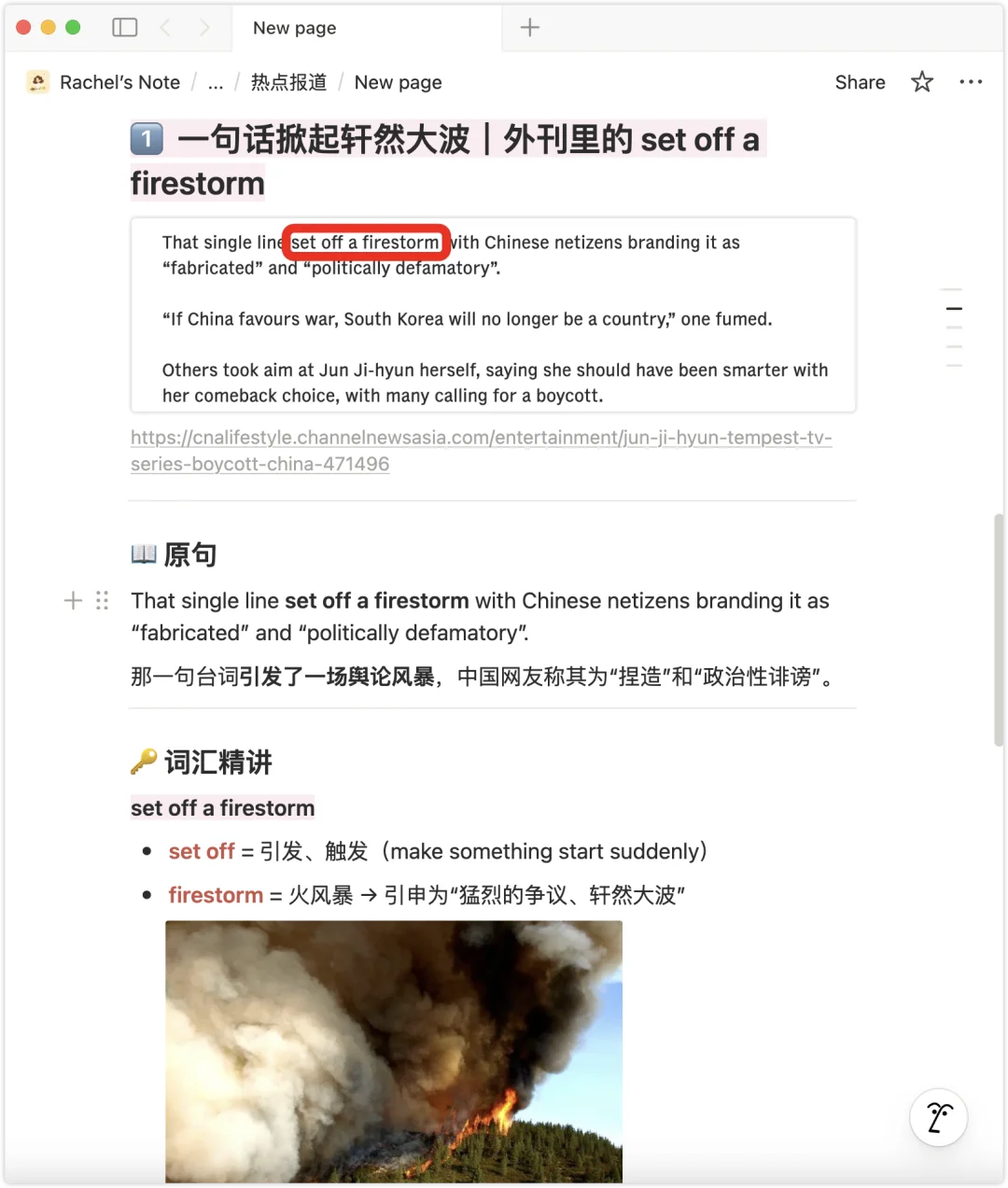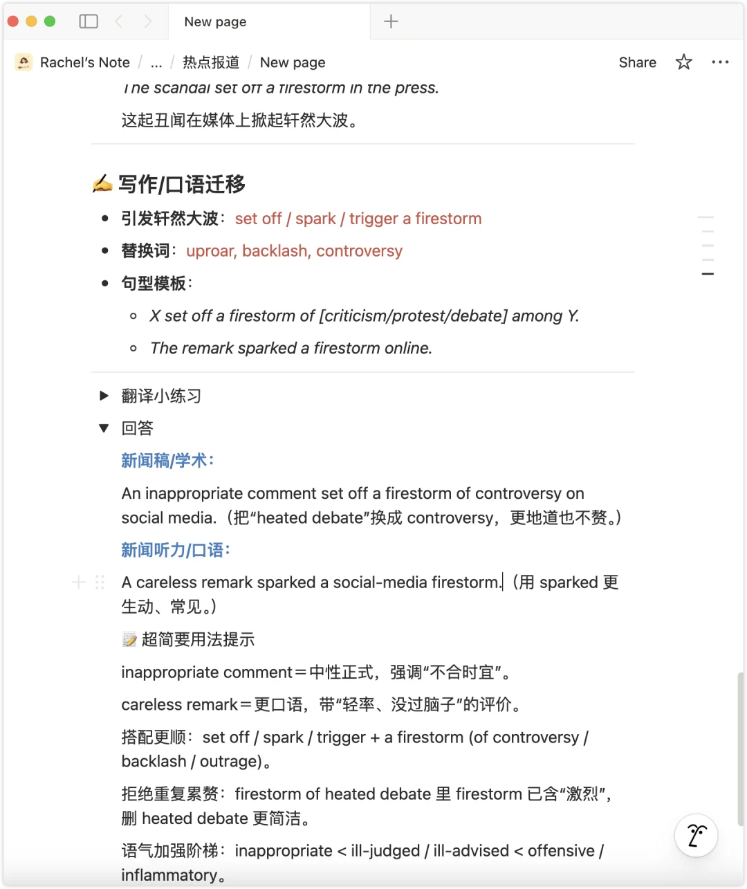 ✏️ set off a firestorm 🔑 表达精讲 set off a firestorm = 引发轩然大波、舆论风暴 👉 常见于新闻里,形容一句话或一个决定瞬间点燃公众愤怒。 🌍 常见搭配 1️⃣ set off a firestorm of criticism → 引发批评风暴 2️⃣ set off a firestorm of protest → 激起抗议浪潮 3️⃣ set off a firestorm in the press → 在媒体上掀起轩然大波 ✍️ 写作/口语迁移 引发轩然大波 = set off / spark / trigger a firestorm 替换词:uproar, backlash, controversy 💡 进阶小贴士 ✅ 动词更替:set off(引爆)、spark(点燃)、trigger(触发),都能搭配 a firestorm。 ❌ 避免重复:不用说 firestorm of heated debate,直接说 firestorm of protest / controversy 就够。 📈 语气加强:inappropriate(不当的) < ill-judged(欠考虑的) < offensive(冒犯的) < inflammatory(煽动性的)。