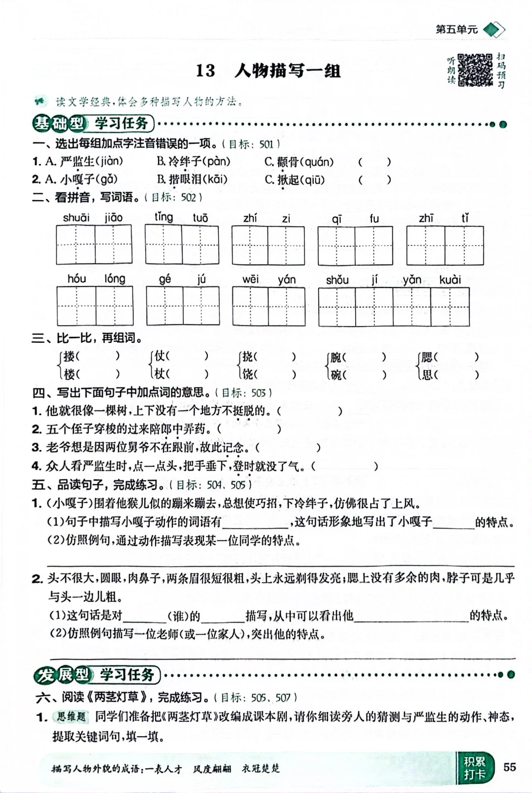 1.认识“嘎”等生字,读准多音字“监”,会写“豉”等字,会写“摔跤”等词语。