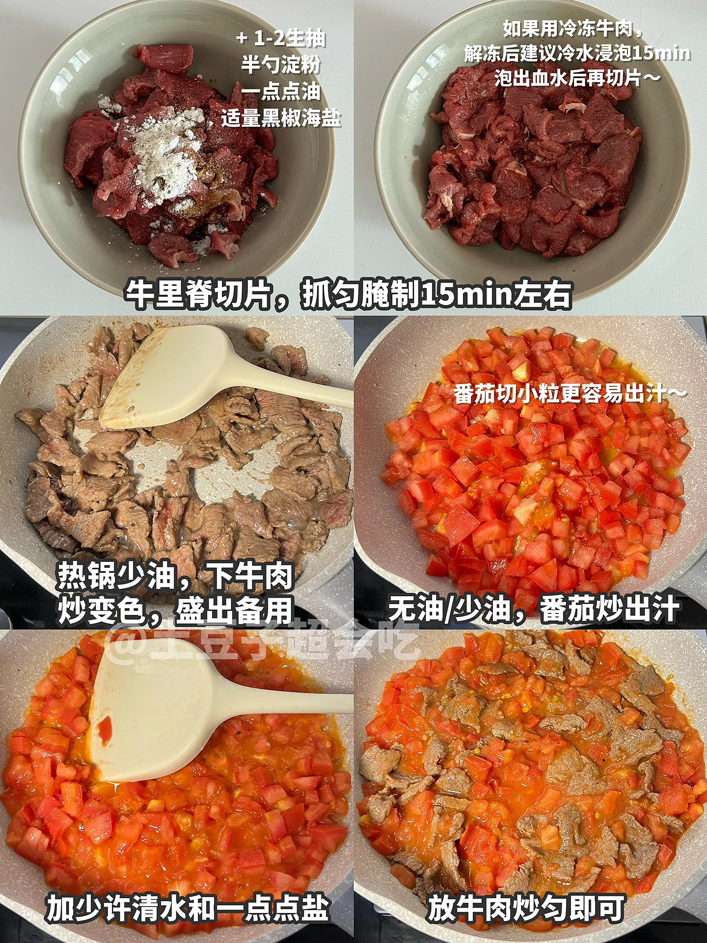 3⃣️ 无油/少油,番茄粒炒出汁,然后加少许清水和一点点盐,放入牛肉片炒匀即可;