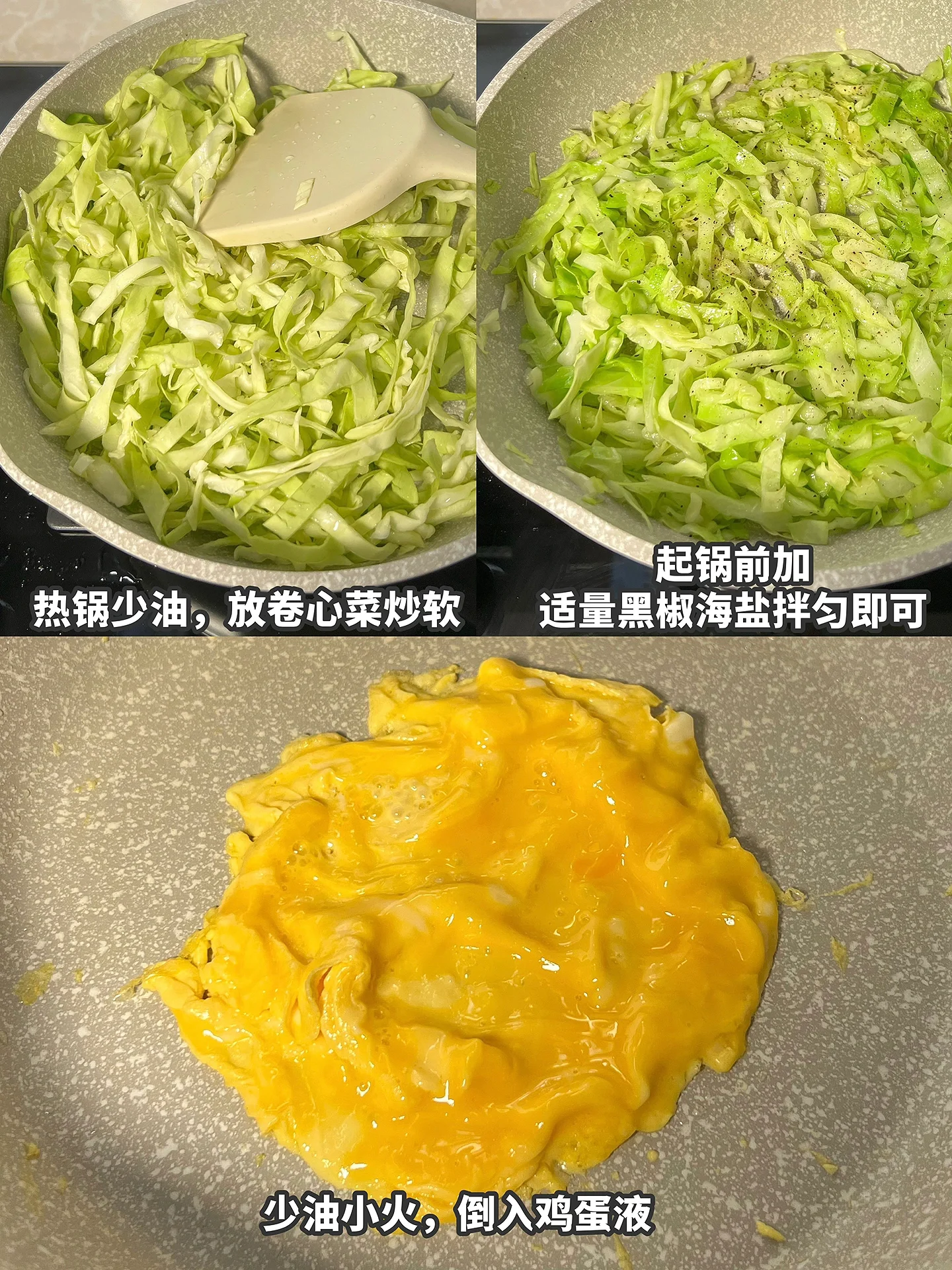 4⃣️ 少油,放卷心菜丝炒软,起锅前加适量黑椒海盐拌匀;