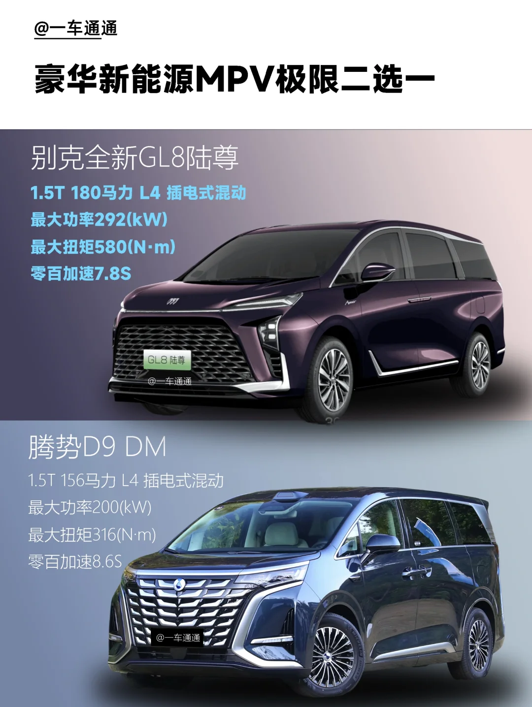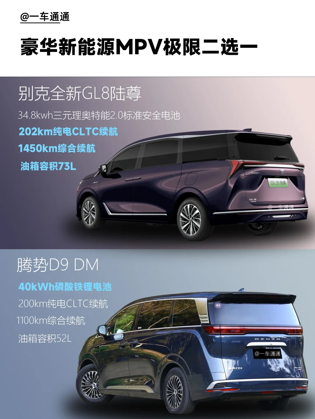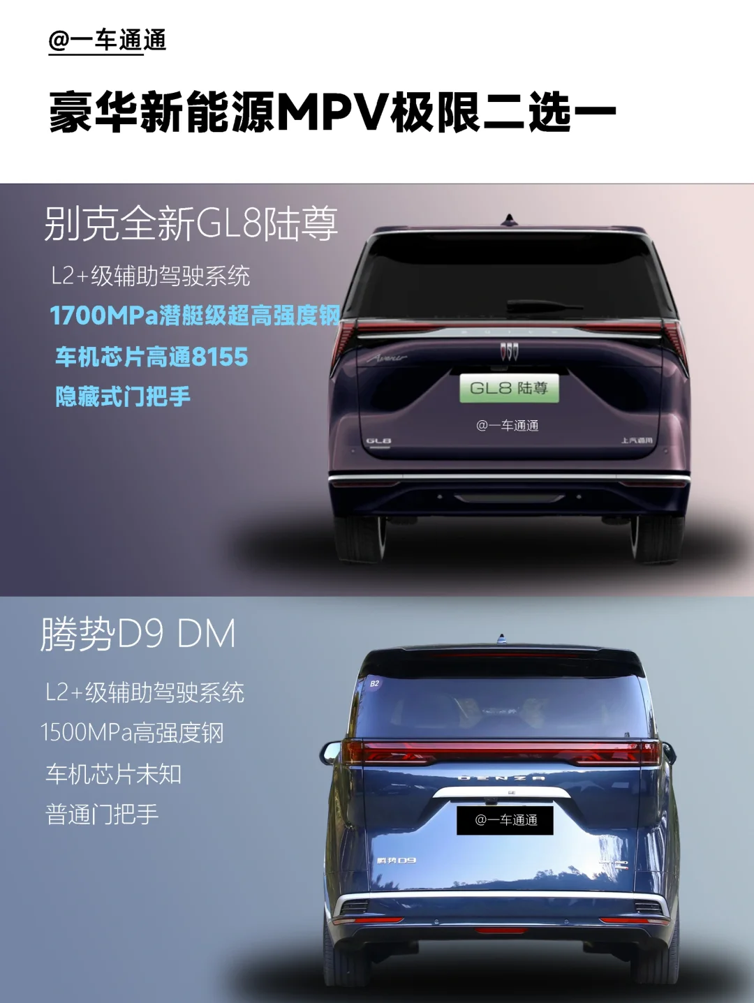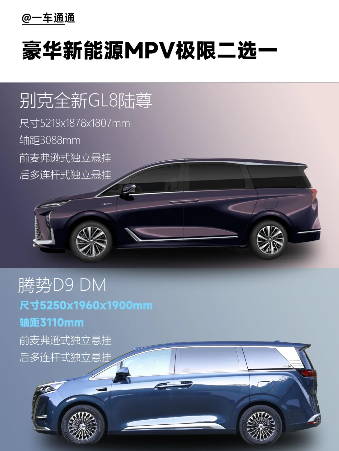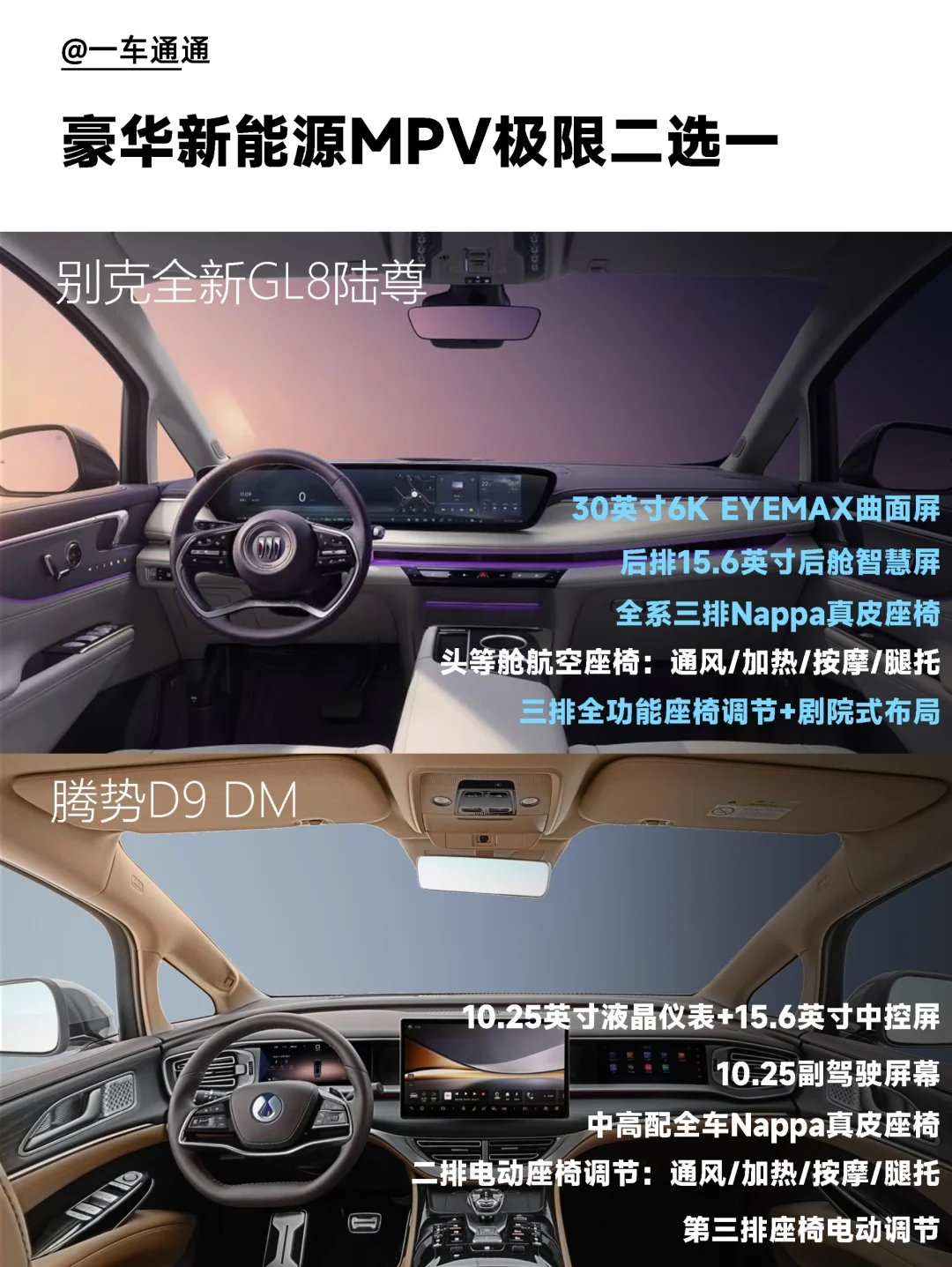 纠结新能源MPV 的宝子们看过来!预算到位了,可别在两款热门车之间选错后悔~ 别克全新 GL8陆尊和腾势 D9,到底谁更配得上 “家用豪华 MPV 天花板”?今天从你最关心的几个点,掰开揉碎了说! 🌟外观 👉全新 GL8 陆尊:新增了紫气东来车身颜色,重点全系标配 2.8 米银翼礼宾光毯,豪华仪式感直接拉满~ 👉腾势 D9:设计偏运动,Dragon Face 家族式前脸辨识度高,贯穿式尾灯设计,车身尺寸更大。 🔋动力续航 👉全新 GL8 陆尊:搭载“真龙”插混Pro系统,202km 纯电续航日常通勤完全够用,1450km 综合续航直接跨省无压力~5C 补能电芯超给力,充电效率- 30%-80%充电仅需15min,新能源mpv优选妥妥的。 👉腾势 D9:纯电续航 190-200km 左右,综合续航 1020km,低温续航衰减略明显,快充速度中规中矩,而且没有5C超充。 🛋️内饰舒适性 👉全新 GL8 陆尊:全车三排 Nappa 真皮座椅!38 道工艺的北美小公牛皮,透气又耐用。二排航空座椅带通风 / 加热 / 8 点按摩,三排还有剧院式布局 + 全功能调节。妥妥的全家人的新能源头等舱! 👉腾势 D9:内饰用料不错,二排座椅调节/通风/加热/按摩功能,排座椅支持靠背角度调节,舒适性日常够用,后排乘坐有一点晕。 总结的来看 追求豪华感、长续航和极致安全的宝子,选全新 GL8 陆尊准没错,对于喜欢年轻设计的朋友,腾势D9也是不错的选择~ 插混MPV推荐 别克GL8 全新GL8陆尊 全家人的新能源头等舱 新能源MPV豪华定义者 腾势D9 能超越GL8的只有绿牌GL8 宝藏新车 RCC飞驰计划 豪华MPV 你怎么选? [PK]